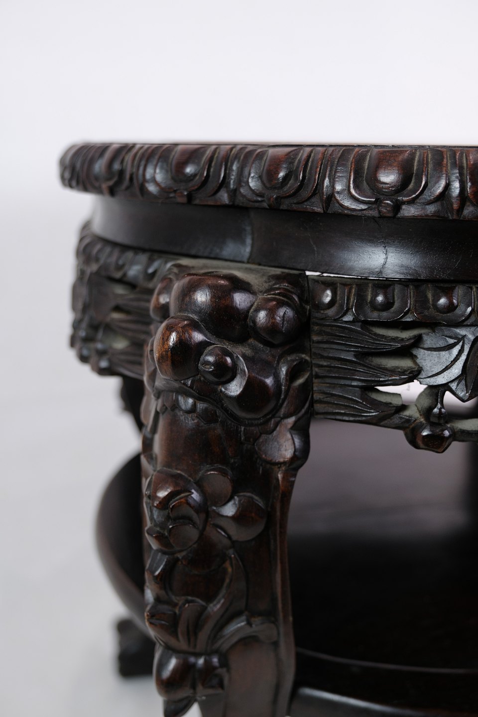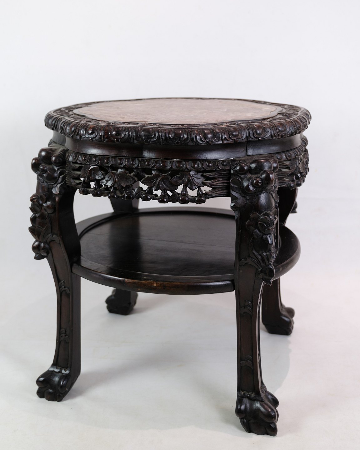 SoldSmall Chinese lamp / side table with fine detailed carvings of high quality with reddish marble top from around 1920s.
