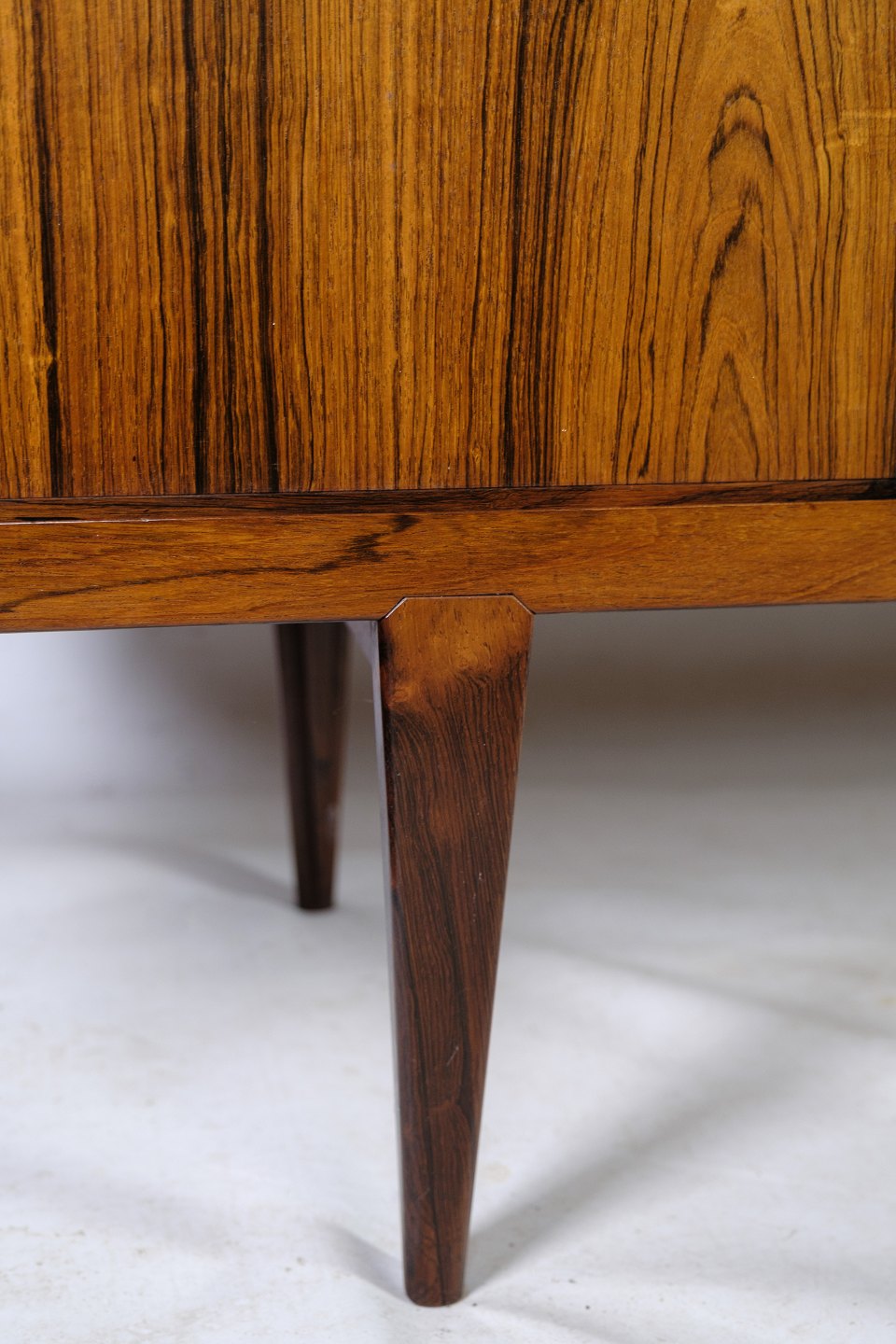 The sideboard in rosewood, designed by Henry Rosengren Hansen and produced by Brande Møbelindustri in 1960, is a splendid example of Danish furniture art from the middle of the 20th century. This sideboard exudes a timeless elegance with its beautiful rosewood, giving a warm and luxurious atmosphere to any room.