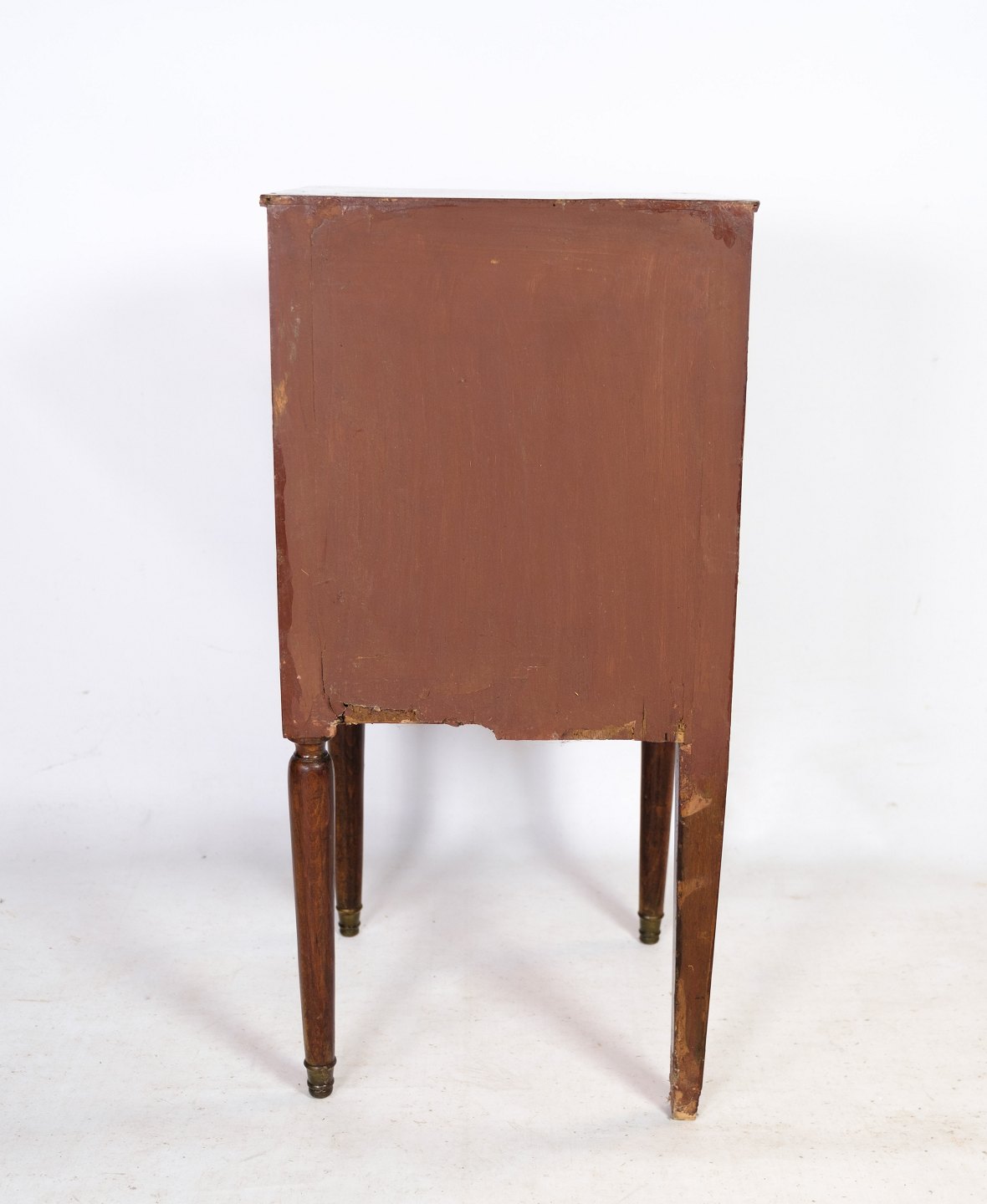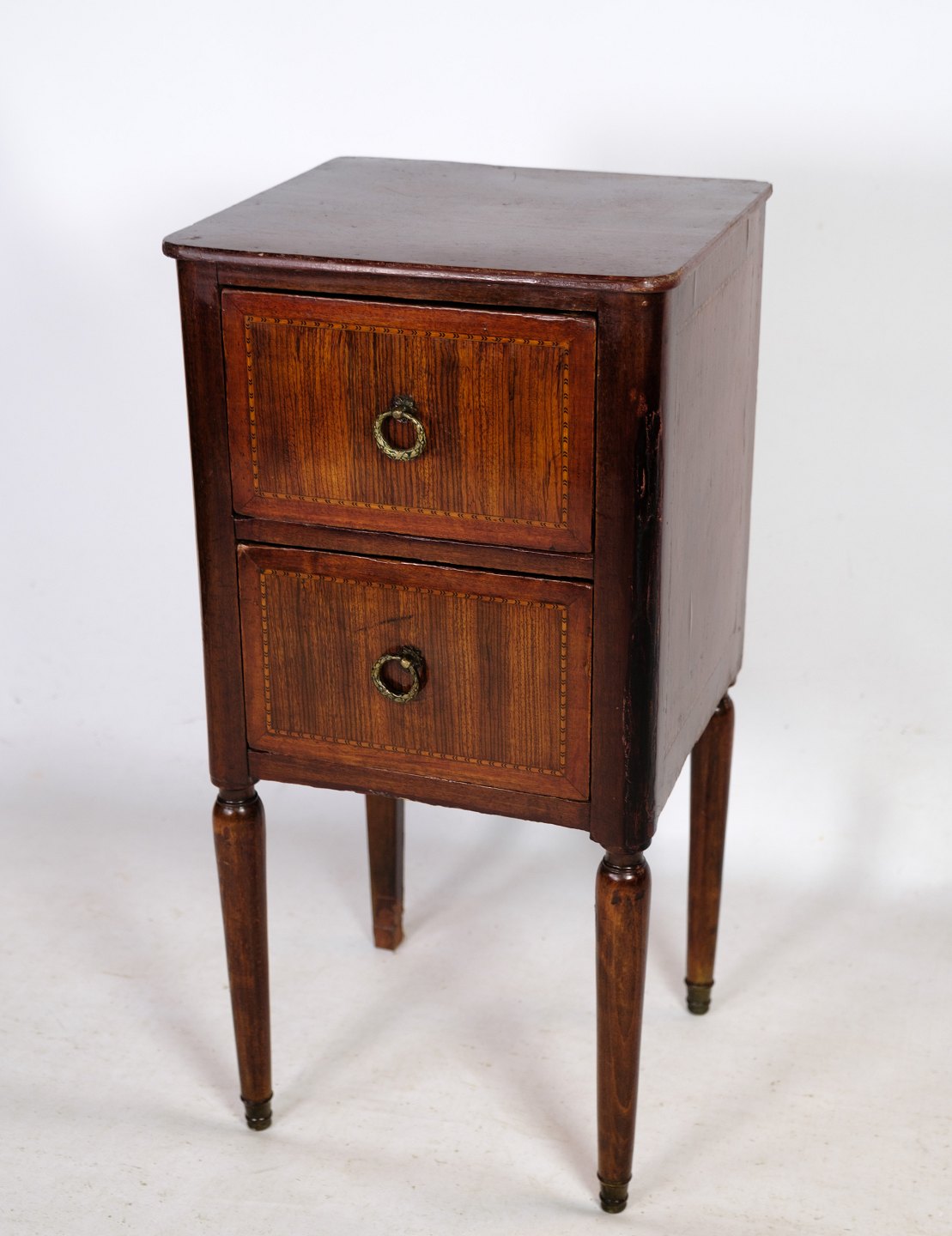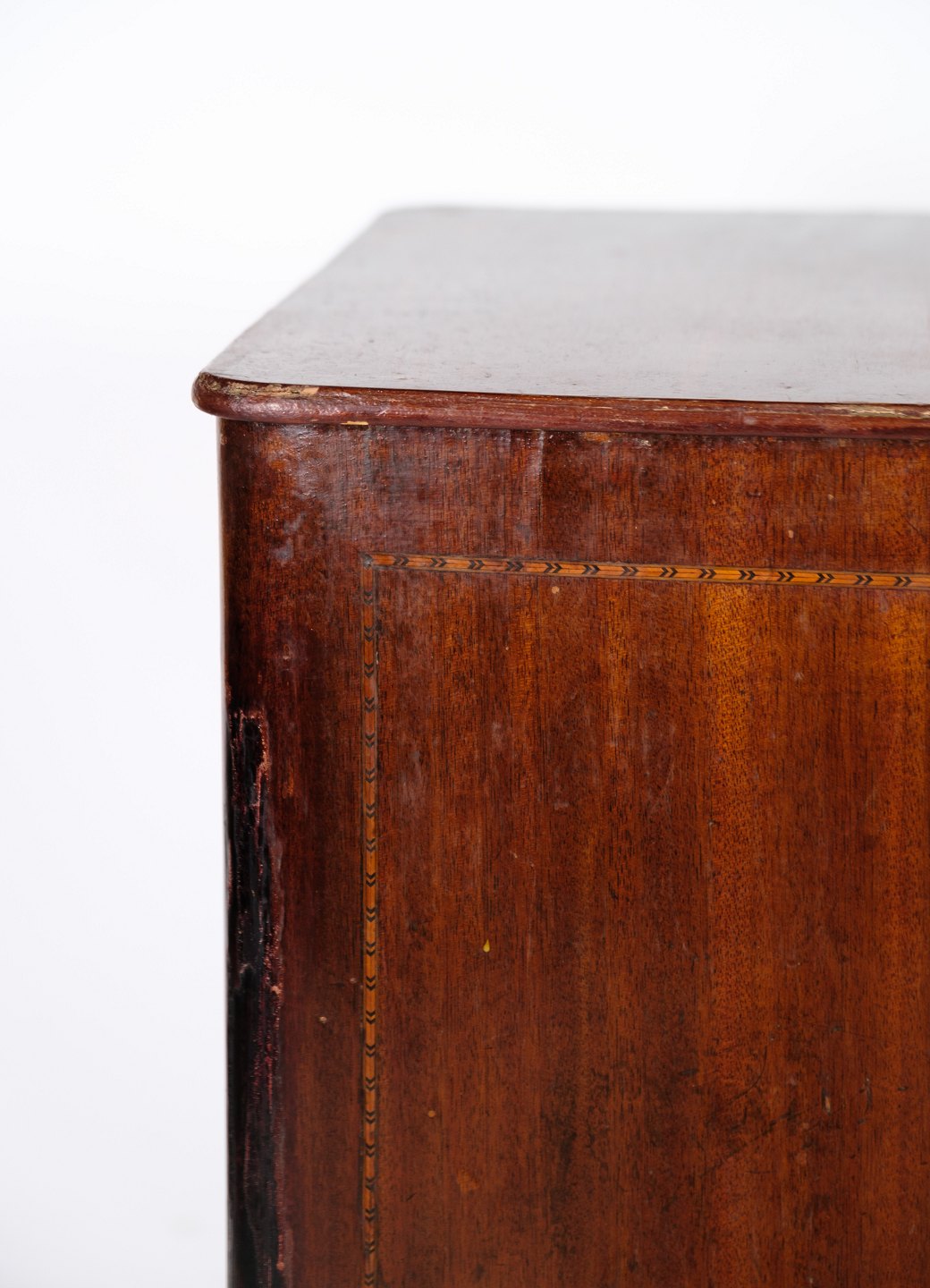 SolgtSidebord i mahogni med intarsia af valnød med to skuffer med original håndtag af messing fra 1860.