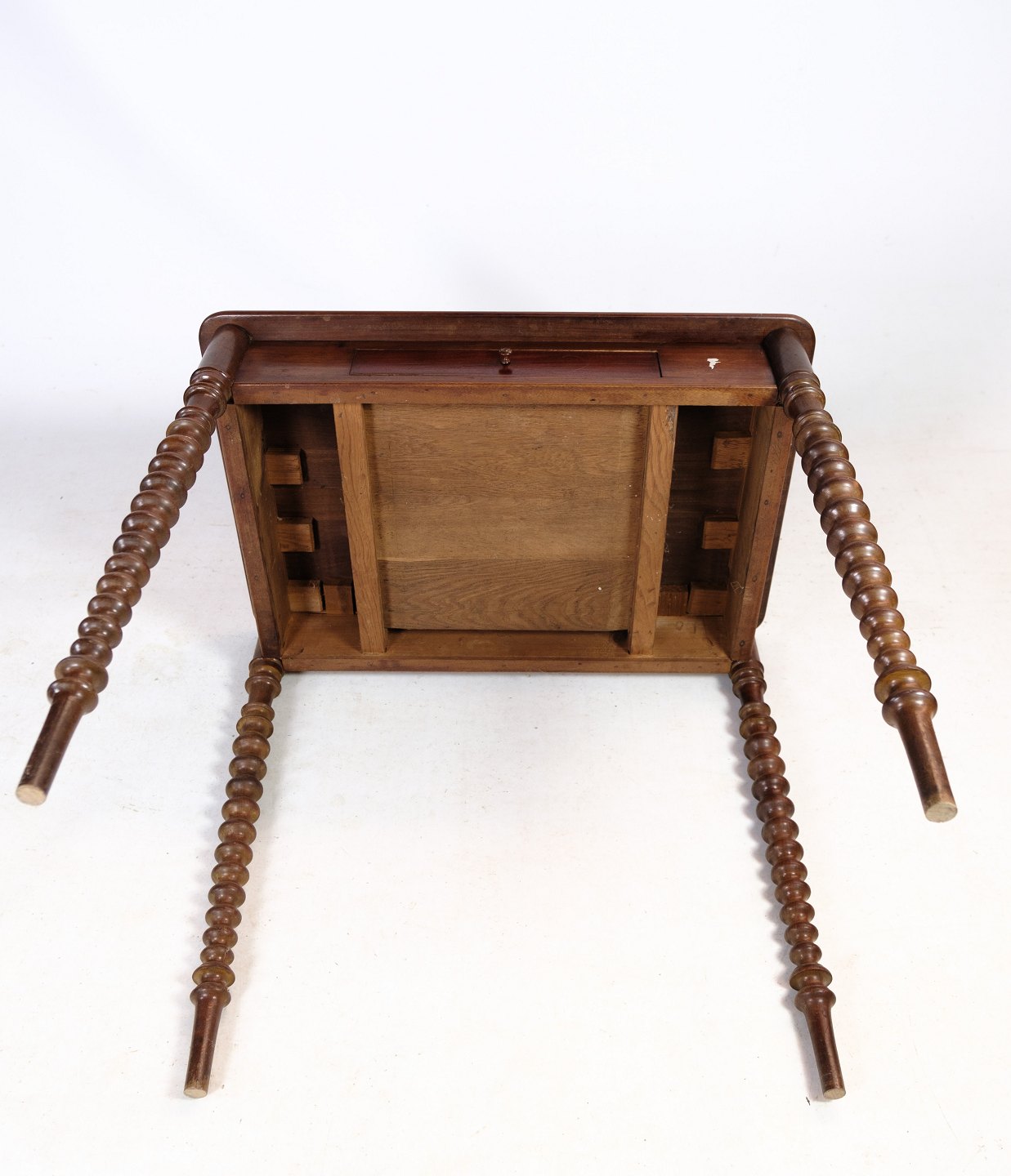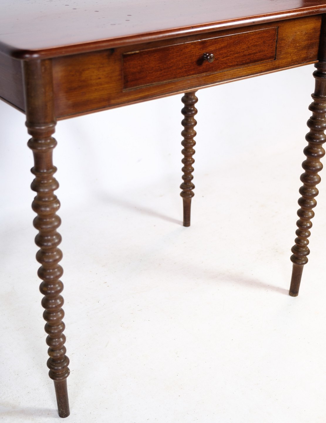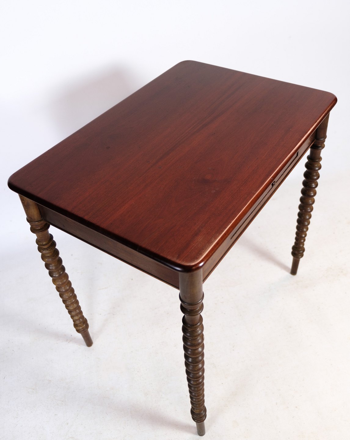 Sidebord i mahogni med skuffe i midten og runde ben fra omkring 1880'erne.