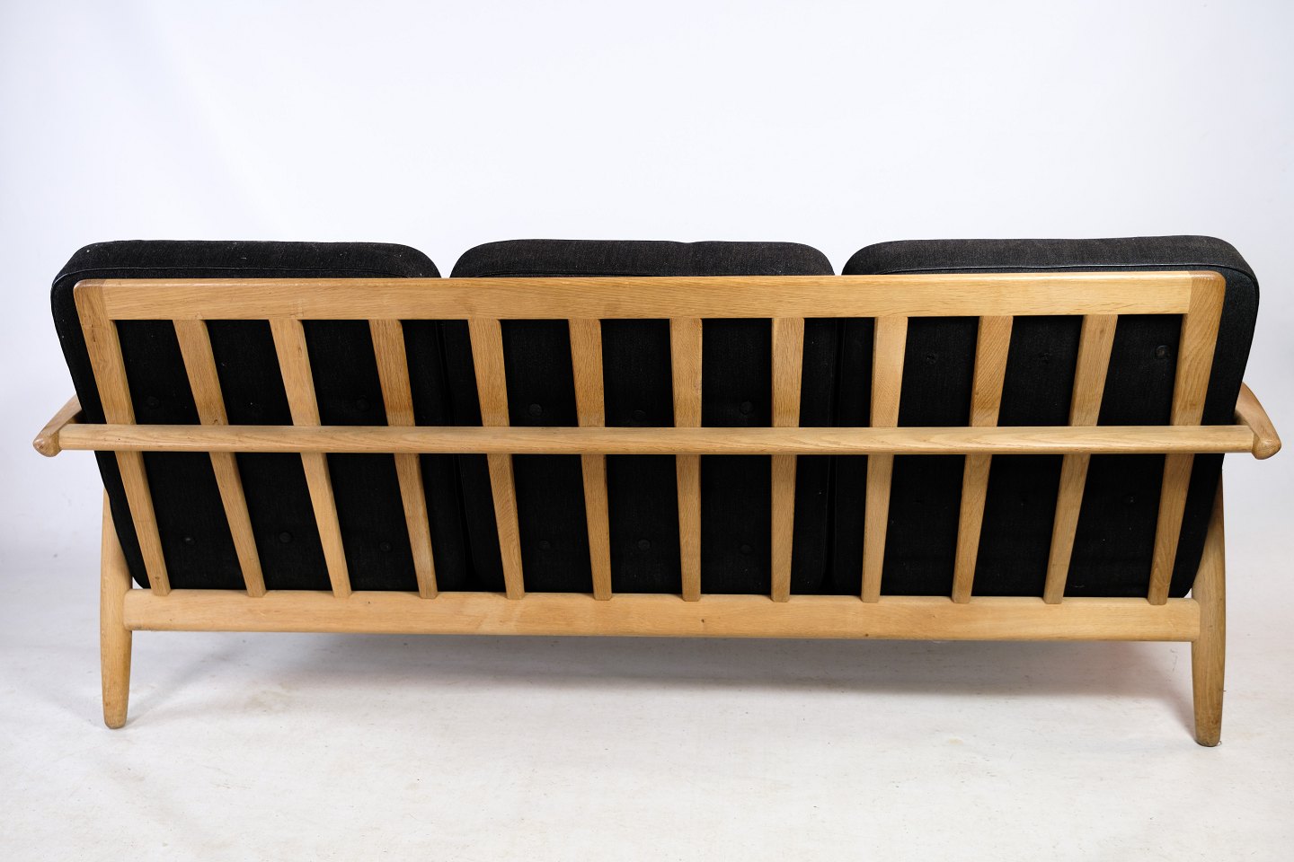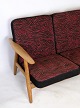 Sold3-person sofa, Model GE 240/ 3, designed by Hans J. Wegner in oak with black and reddish decorated cushions from the 1960s.