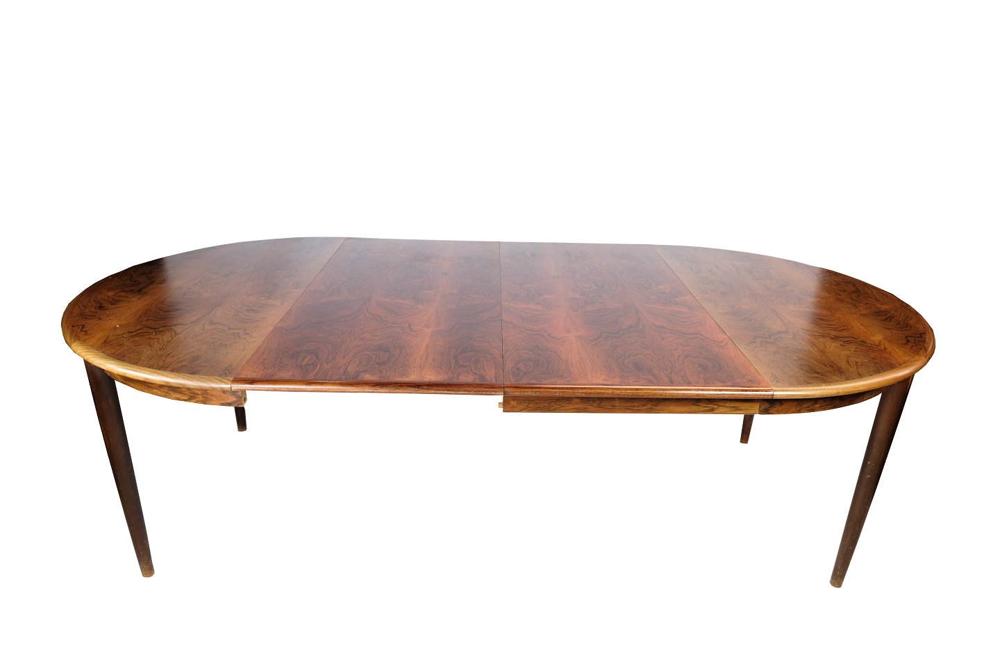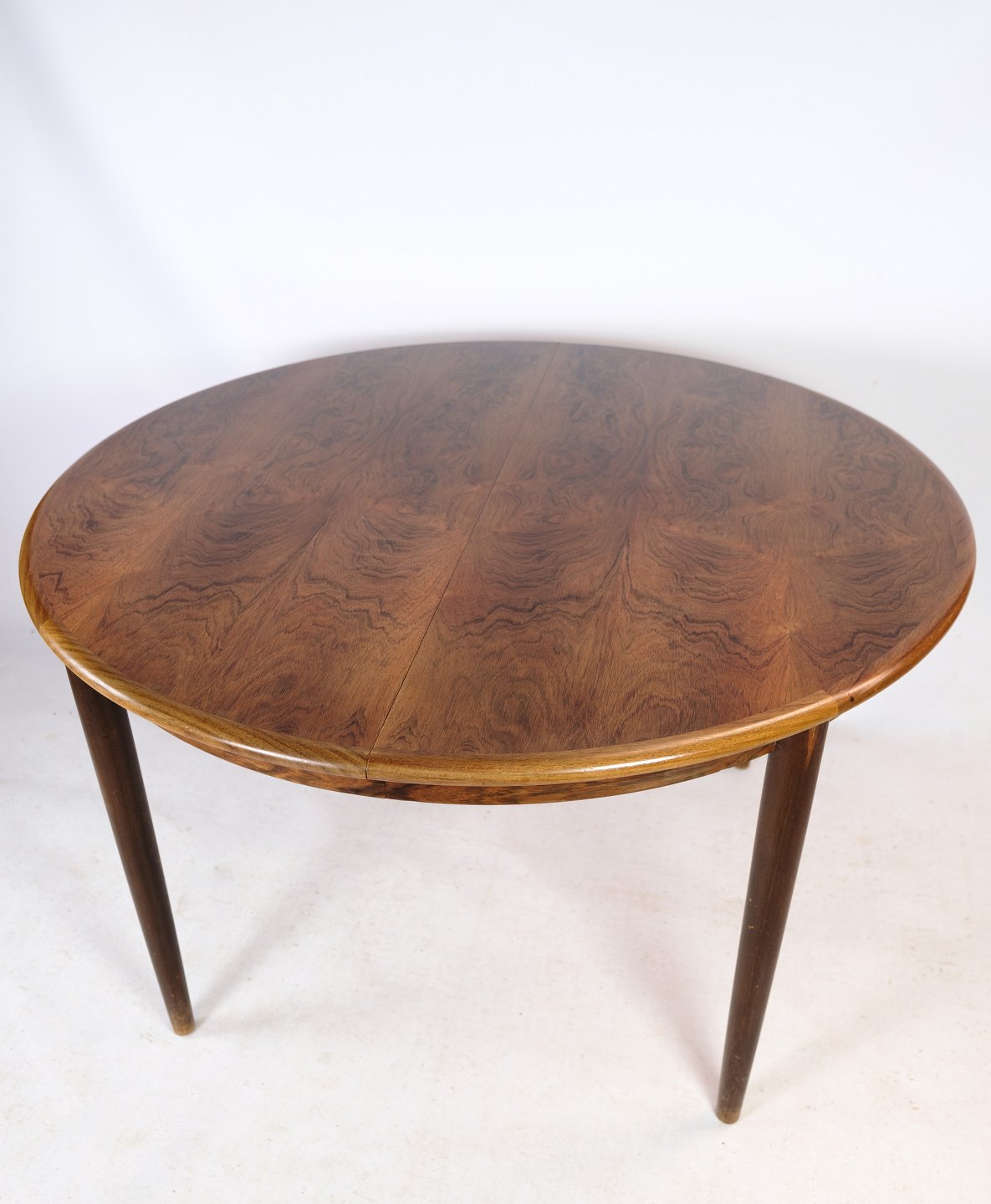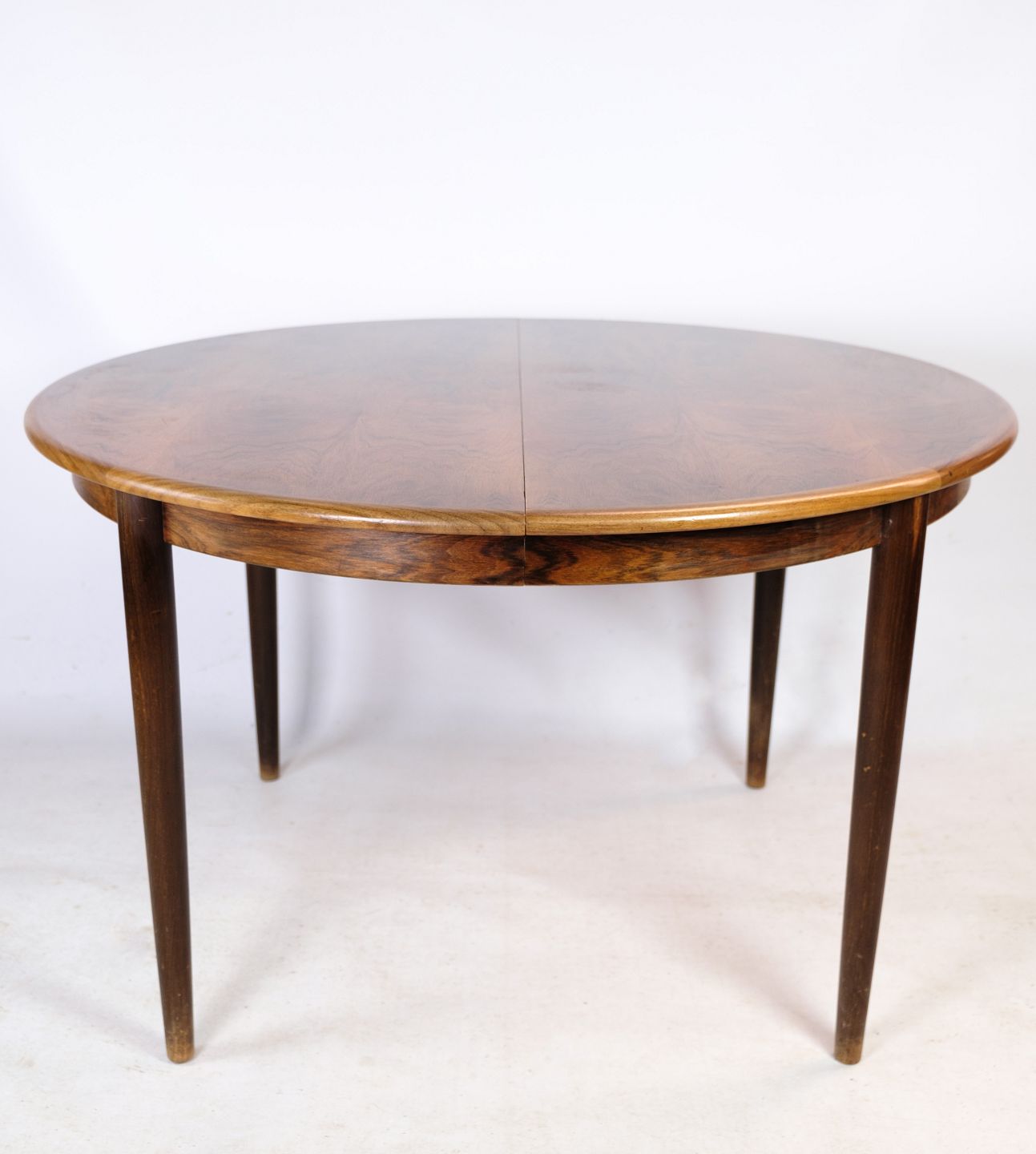 SolgtRundt spisebord i palisander i dansk design produceret af Skovby Møbelfabrik fra 1960'erne. 2 tillægsplader den ene med sarg af fineret palisander. Står i meget fin stand. Tillægsplader kan renoveres så det matcher resten af bord. Kontakt os