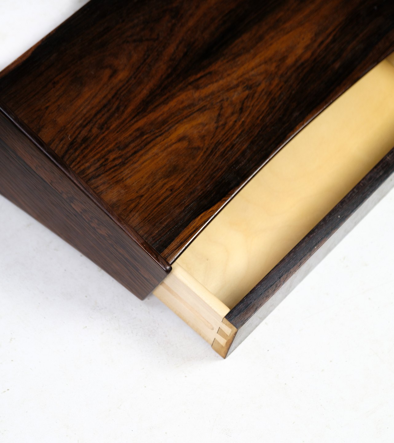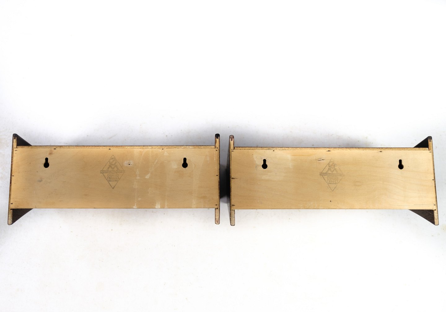 SolgtEt sæt væghængte natborde i palisander med skuffer fremstår med stempler af Ølholm Møbelfabrik, Horsens fra omkring 1960'erne.