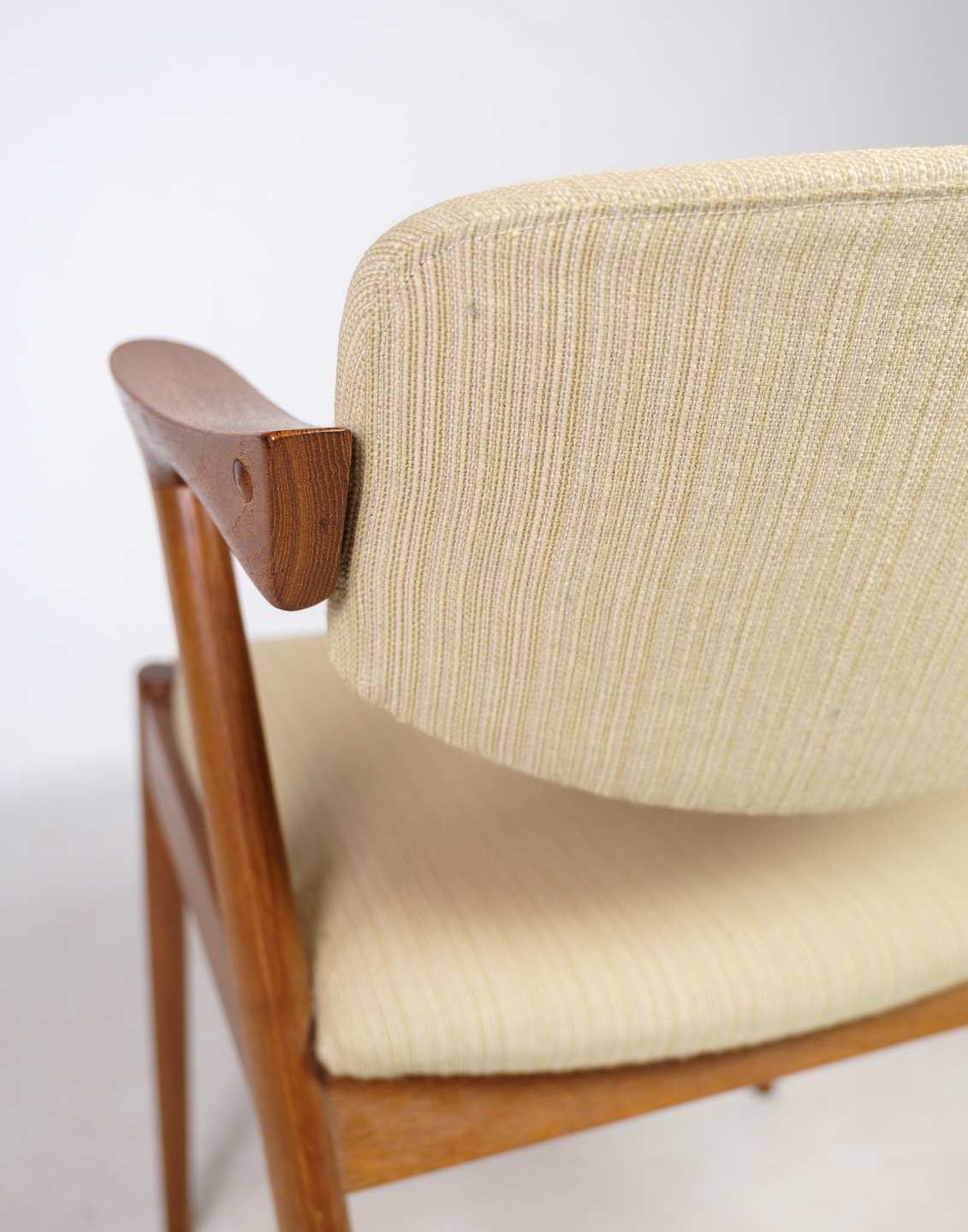 The chairs have a classic and minimalist design with an organic shape that is both comfortable and aesthetically pleasing. The seat is upholstered in light fabric, which adds an extra dimension of elegance and luxury, while the frame is made of teak wood, which provides a warm and natural contrast.