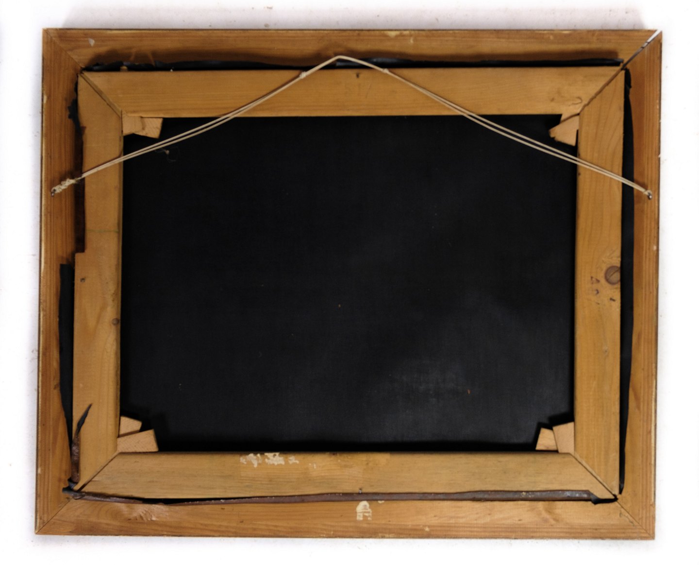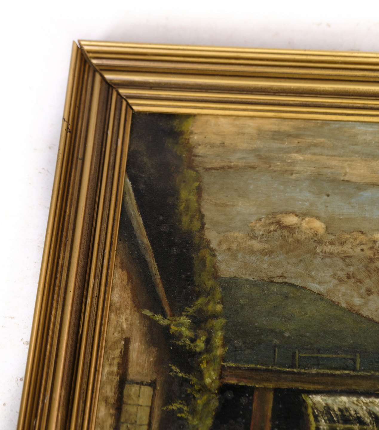 Maleri på lærredet i guldramme af byhus og vand i blå farver fra omkring 1930'erne.