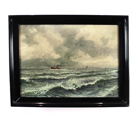 Maleri på lærredet i guldramme af byhus og vand i blå farver fra omkring 1930'erne.