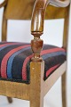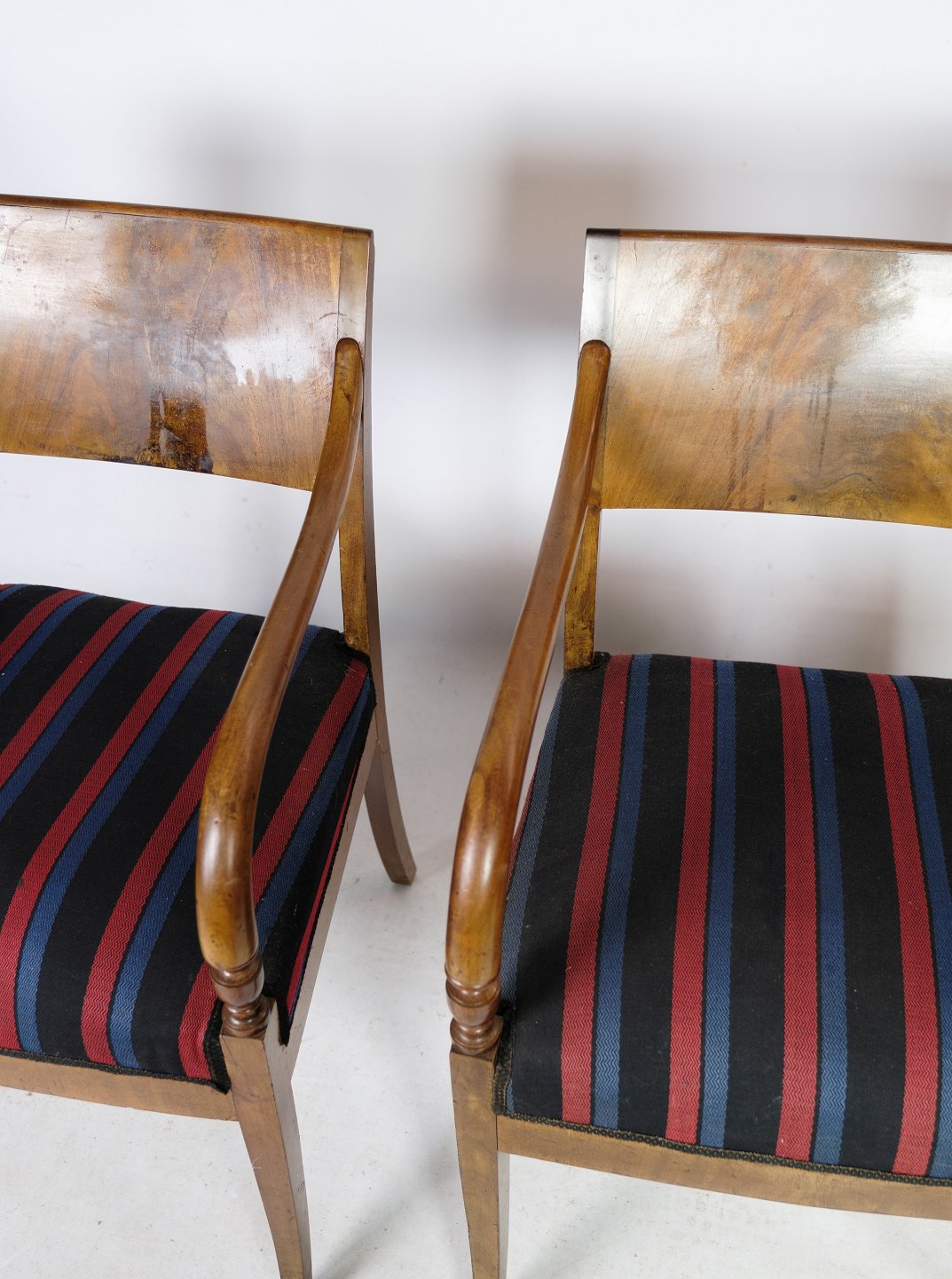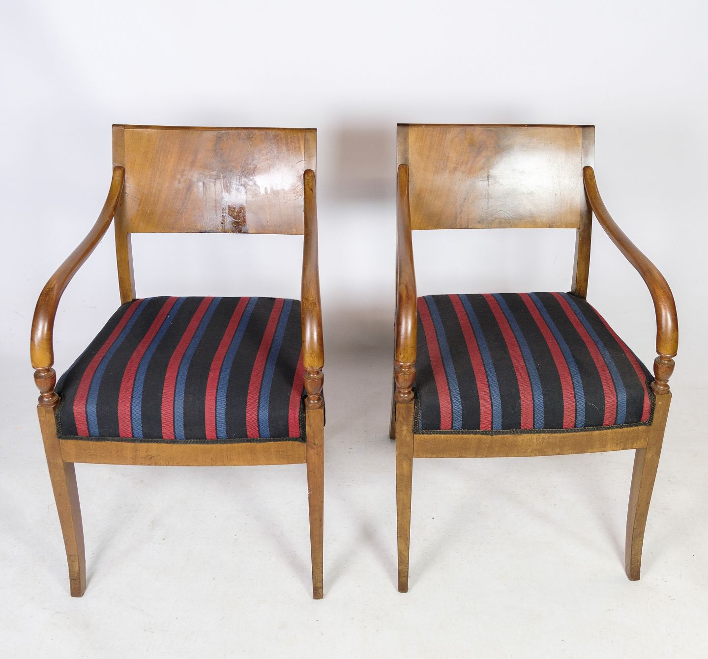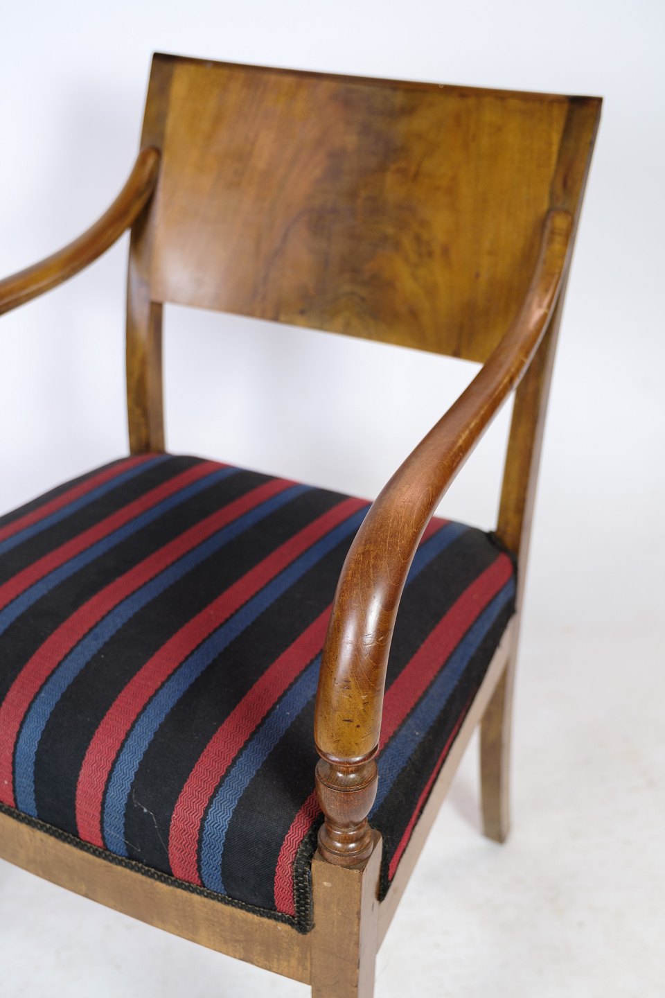 A pair of Danish Empire style hand-polished mahogany armchairs with striped fabric from around the 1920s.