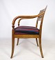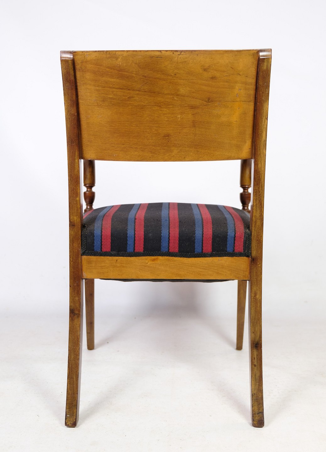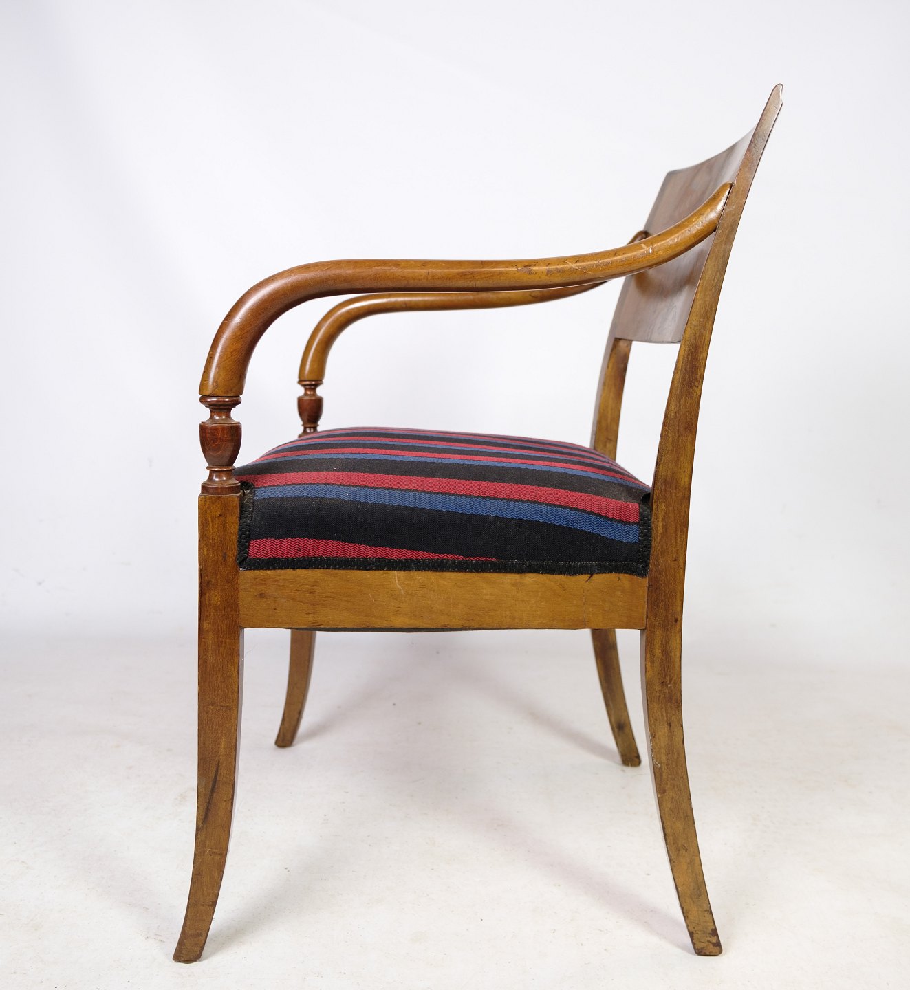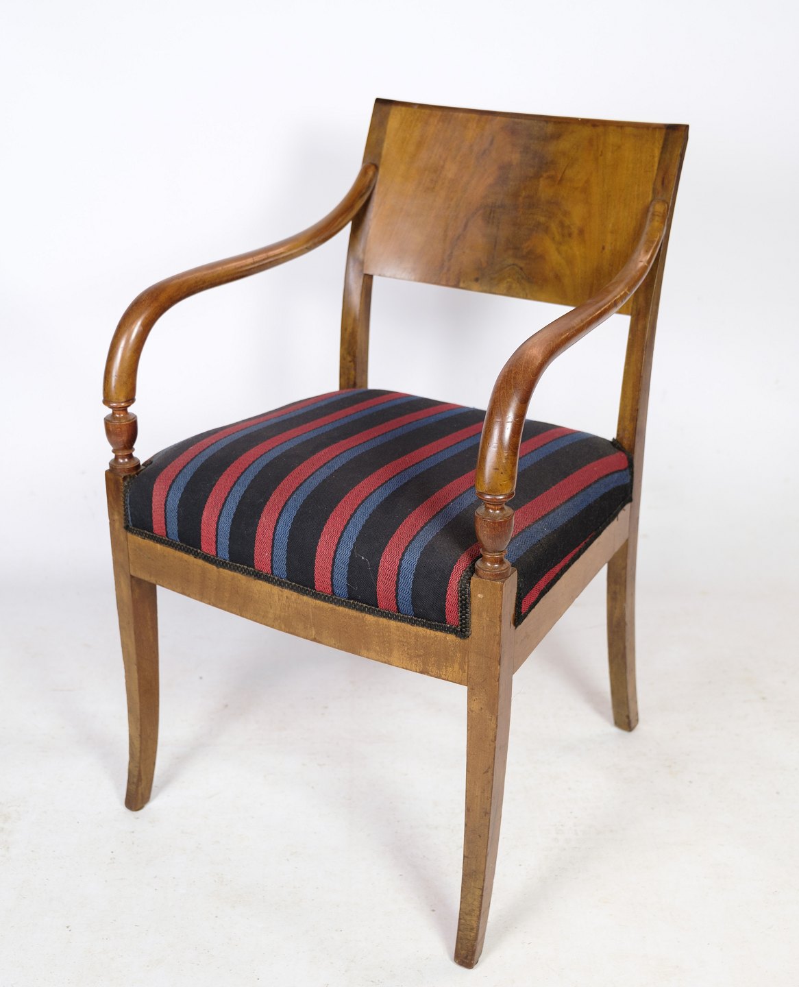 A pair of Danish Empire style hand-polished mahogany armchairs with striped fabric from around the 1920s.
