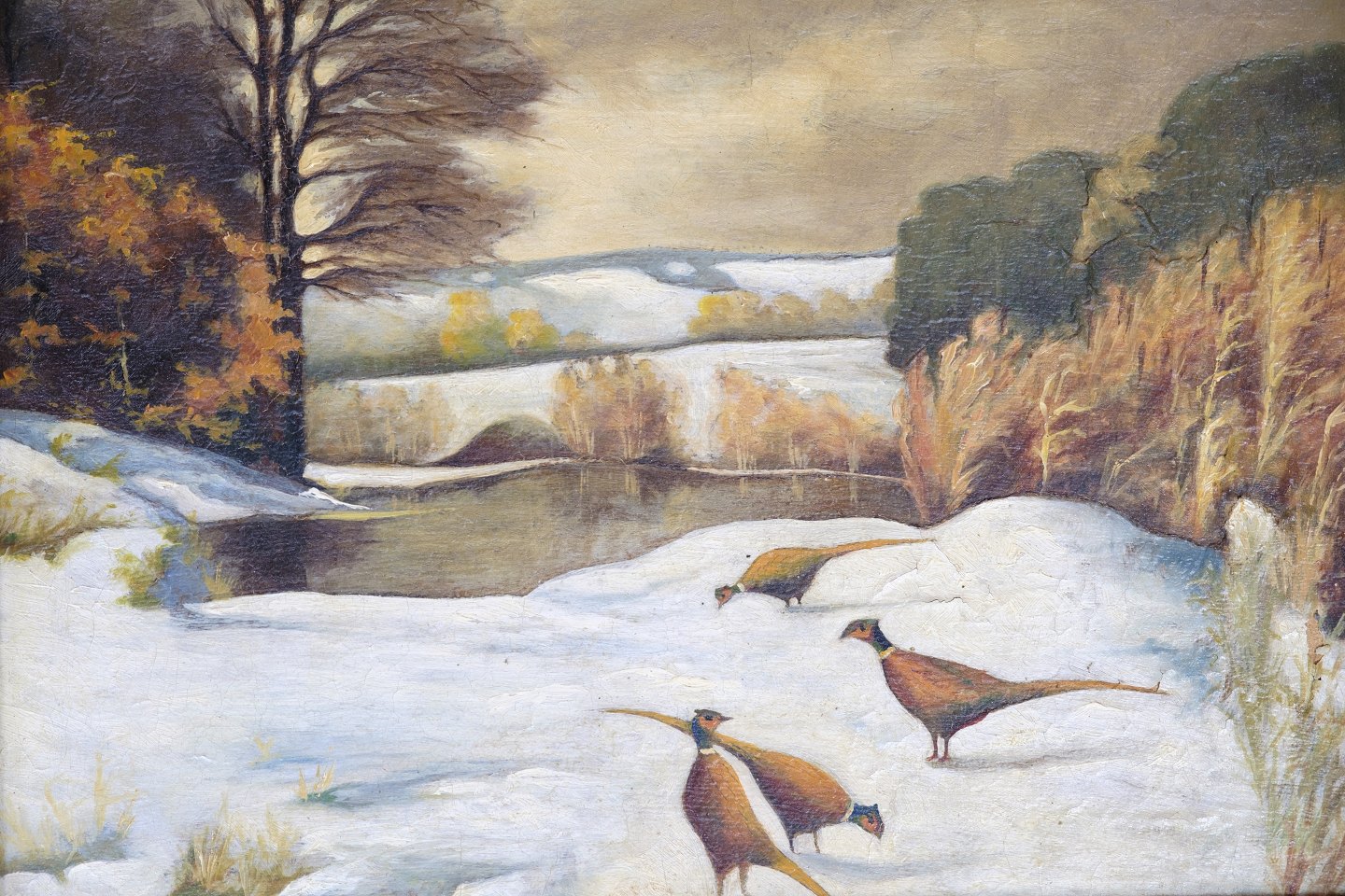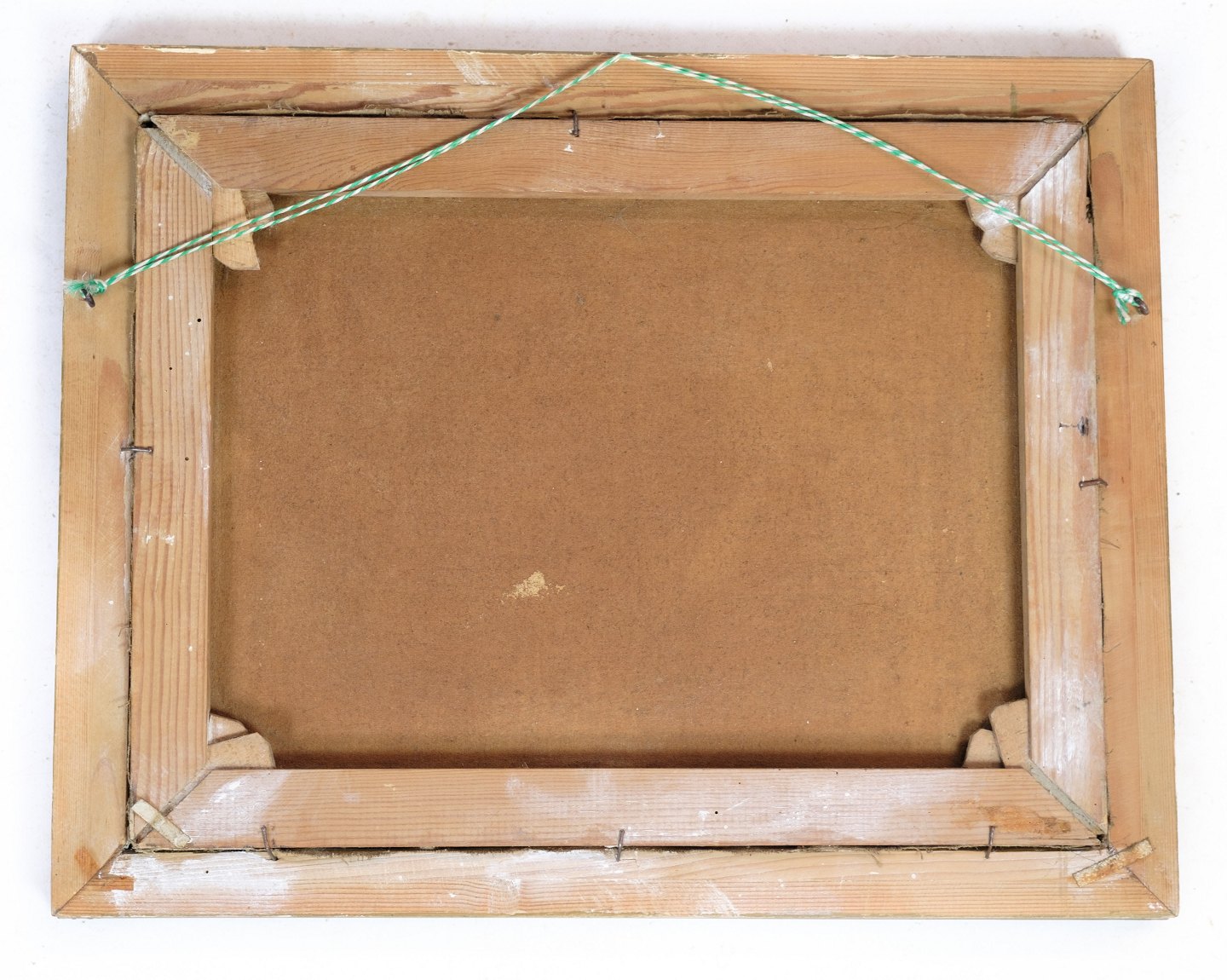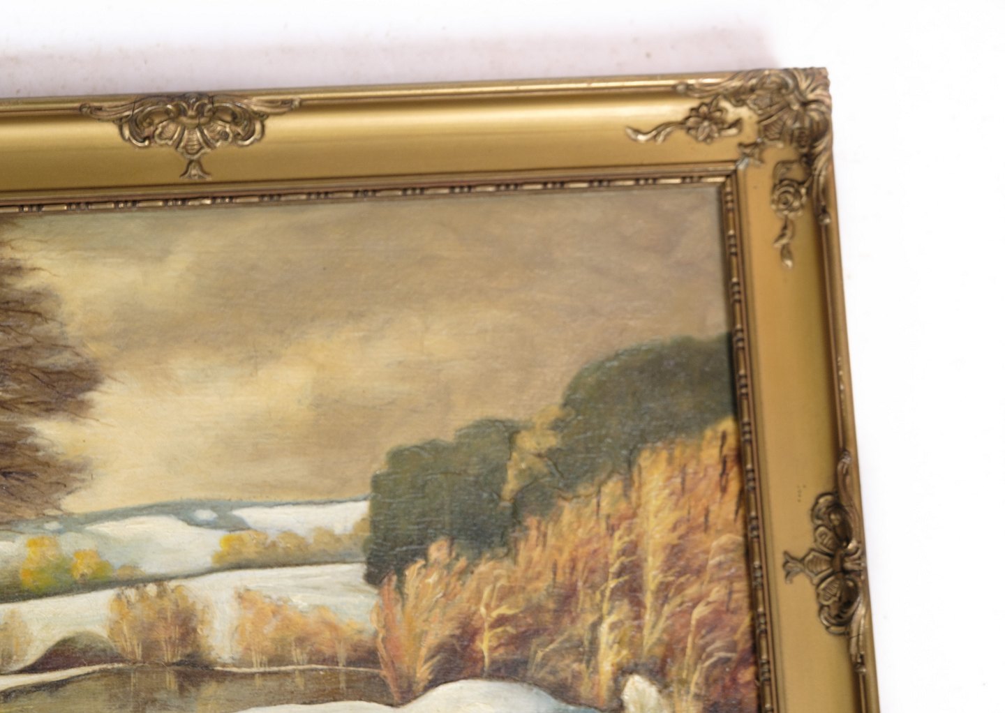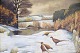 Maleri på lærredet i antik ramme af små huse og landskab med sne fra omkring 1930'erne