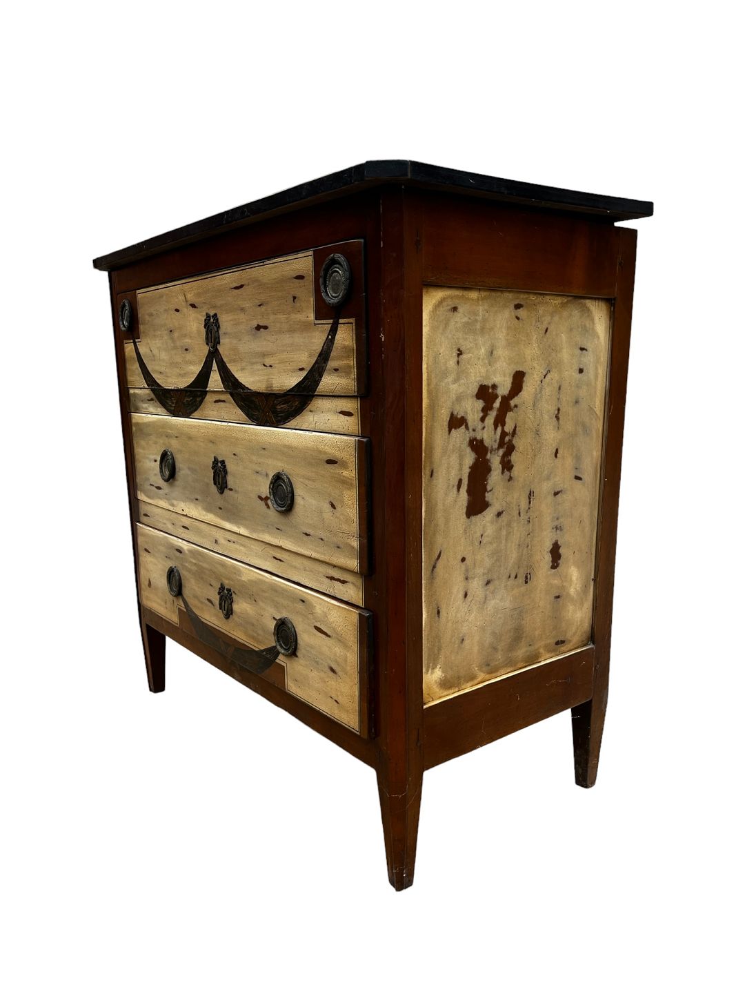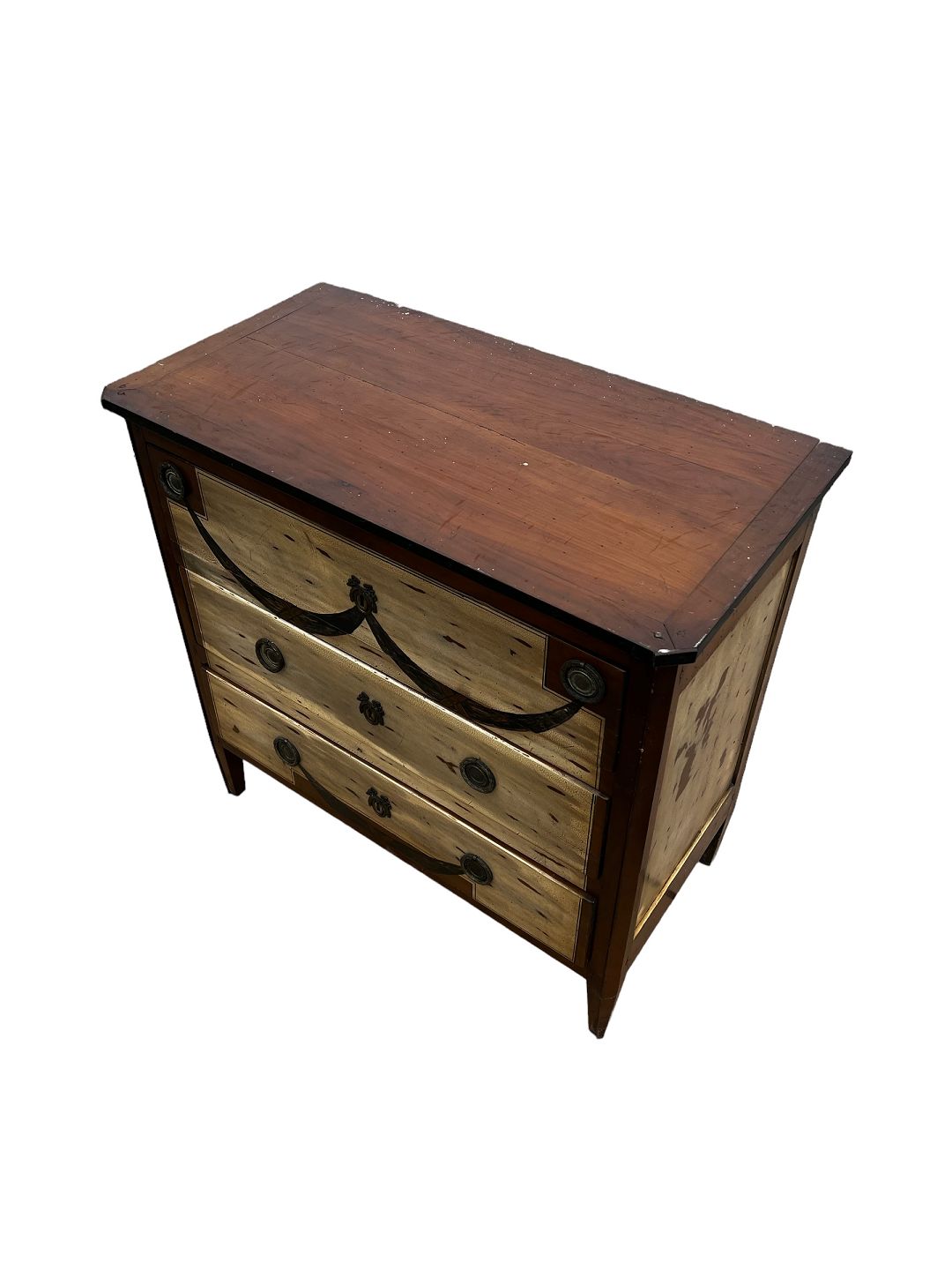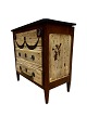 Kommode i mahogni og forskellige træsorter i form af frugttræ med patina. Fra år 1890 erne