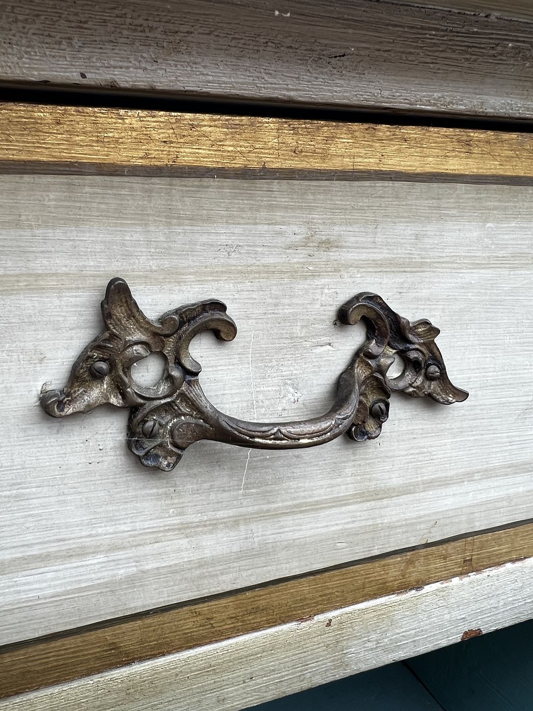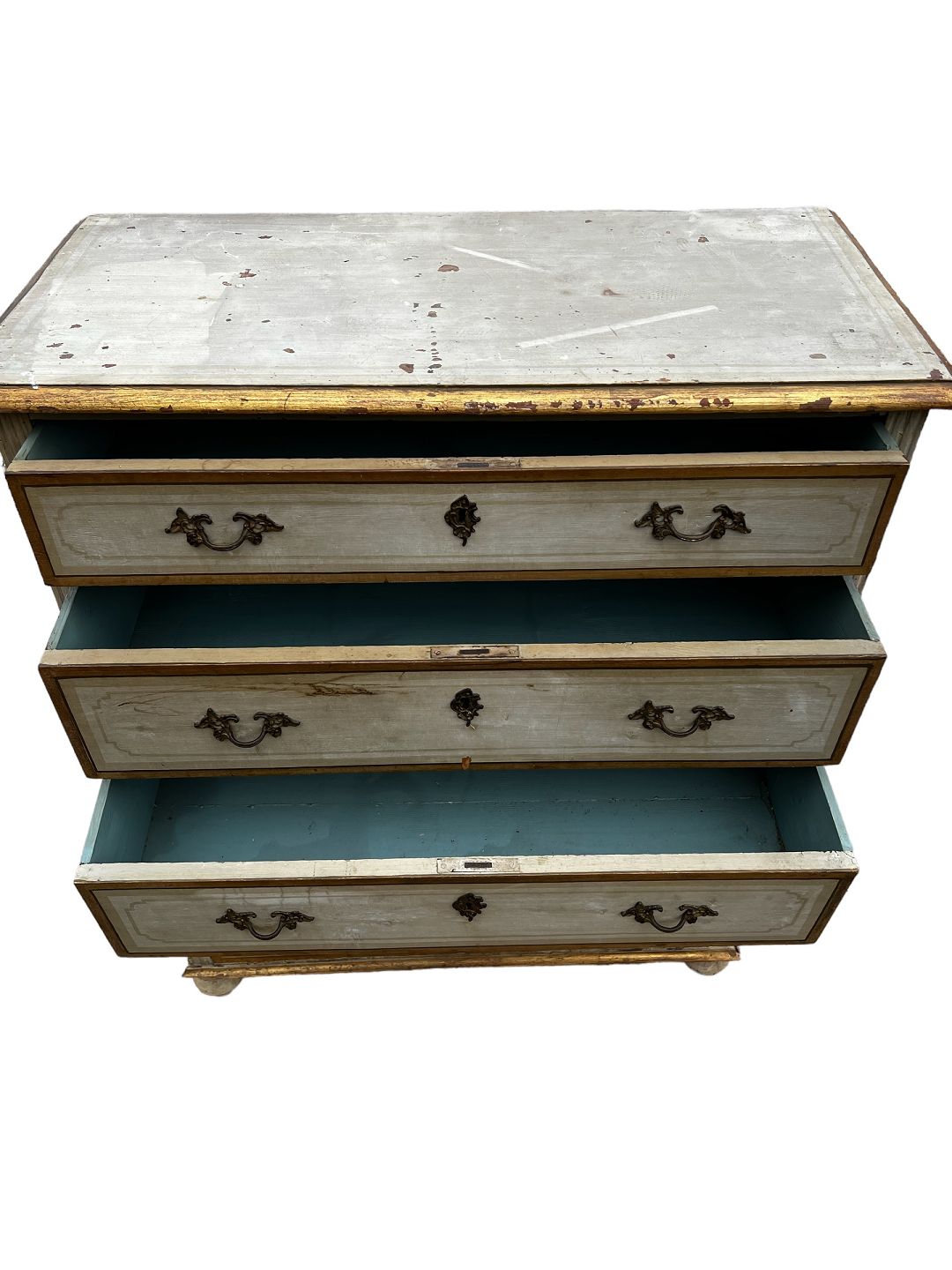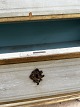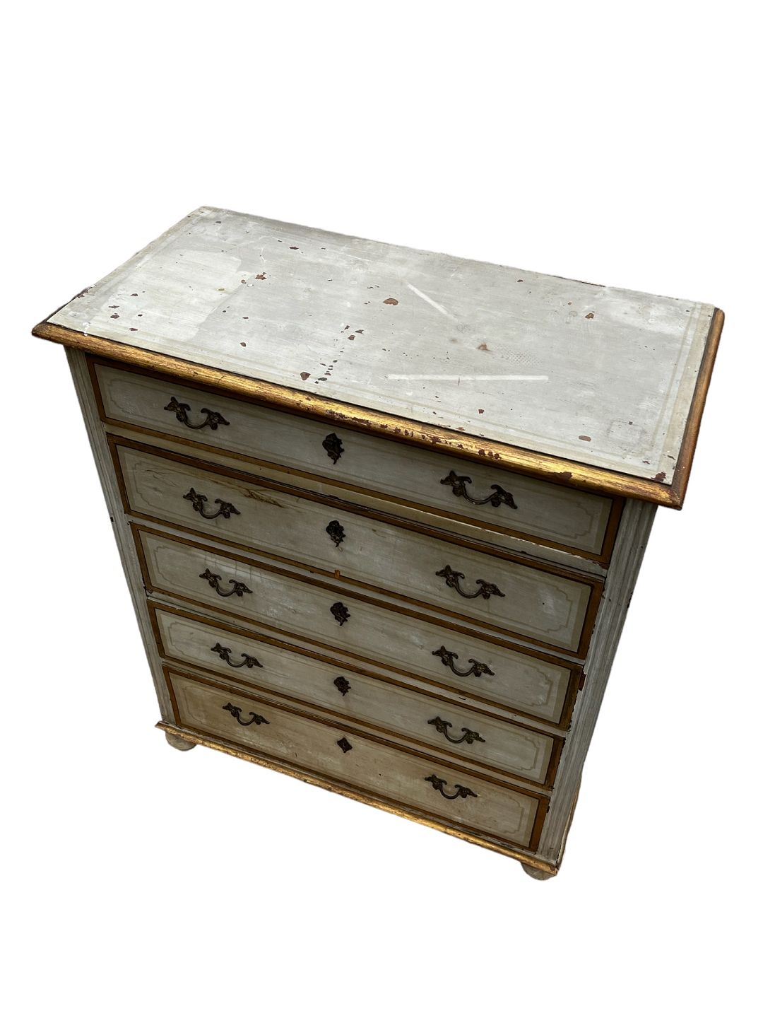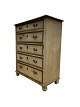 Kommode i bemalet træ med patina i lyse farver med udsmykkede håndtag og 5 skuffer fra omkring år 1890'erne.