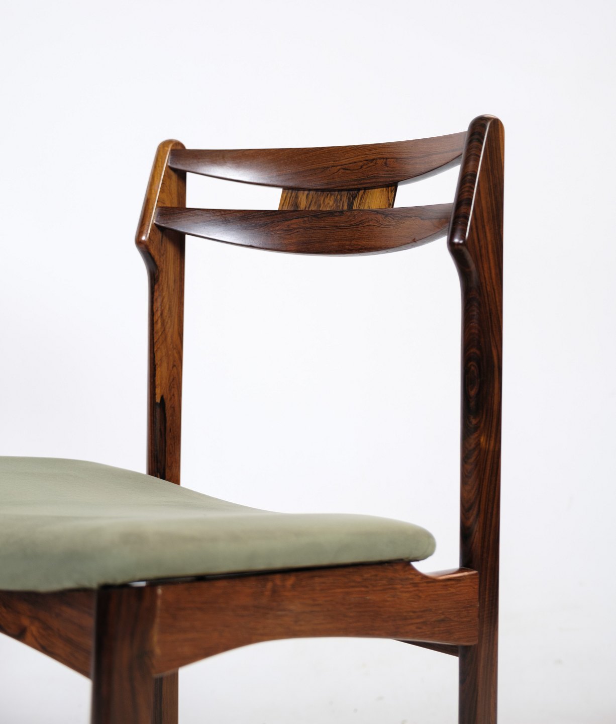 Sæt af 12 spisestuestole af palisander med grønt stof fra omkring 1960'erne. Et sæt stole af høj kvalitet og håndværksmæssig arbejde. De står alle i meget fin stand i både stof og træ. Sjældent udbudt.