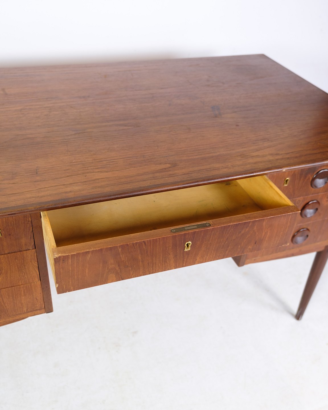 Dette skrivebord i teaktræ fra omkring 1960'erne er et smukt eksempel på dansk design æstetik og funktionalitet. Med sin elegante konstruktion og fine detaljer tilbyder det en perfekt balance mellem stil og brugbarhed.