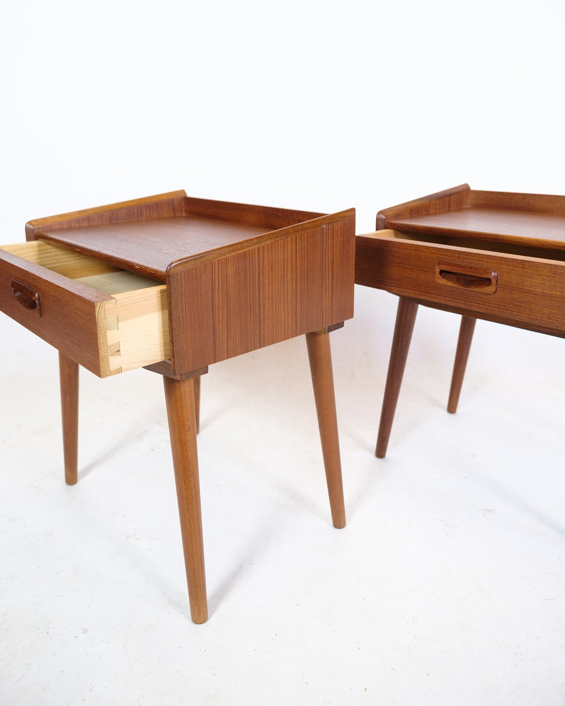 SolgtEt sæt af 2 natborde af dansk design i teaktræ med skuffe med håndtag fra omkring 1960'erne.