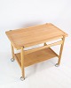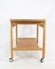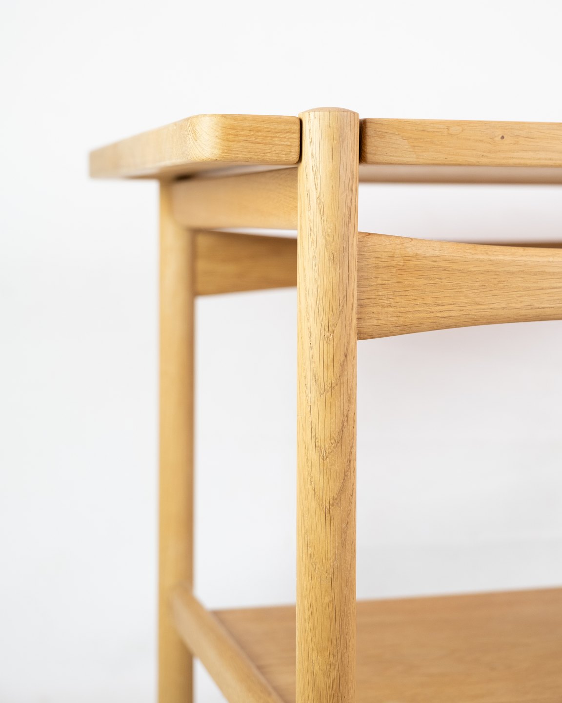 "AT 48" is the name of a serving trolley designed by Hans J. Wegner. The serving trolley is made of solid oak and has a reversible top, which makes it extra practical and functional. The underlying shelf also adds extra storage space, making the serving trolley ideal for serving and transporting various items.