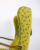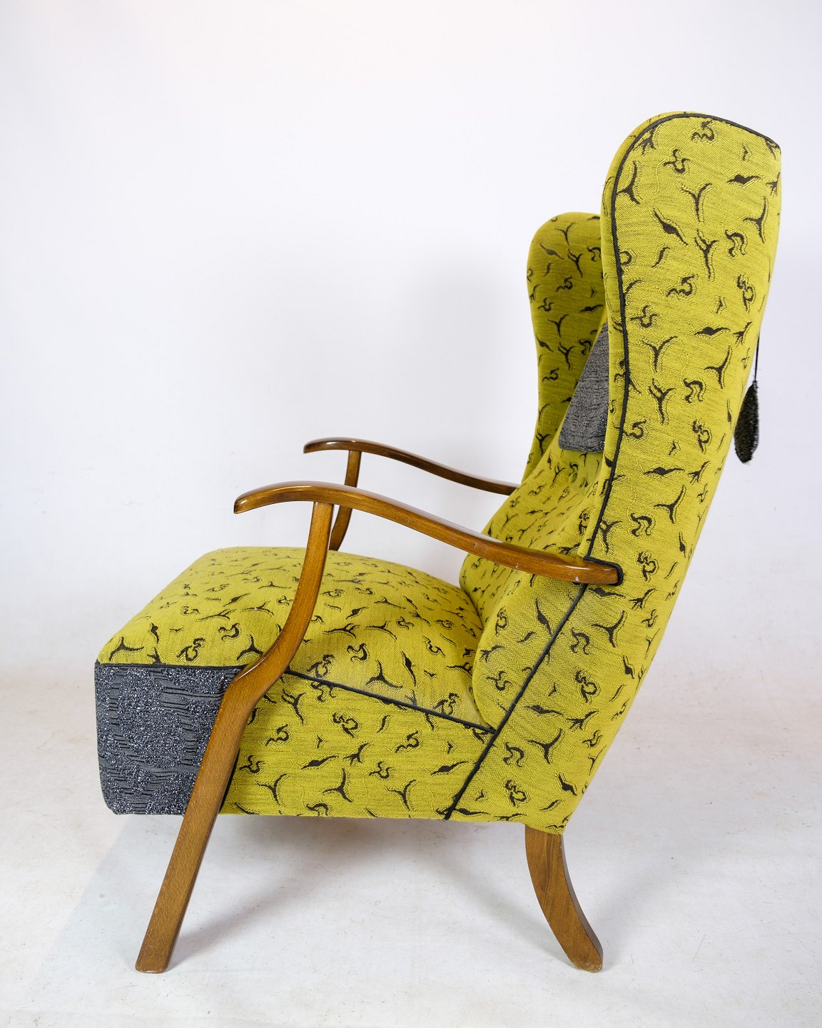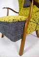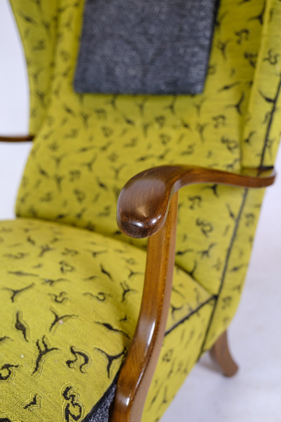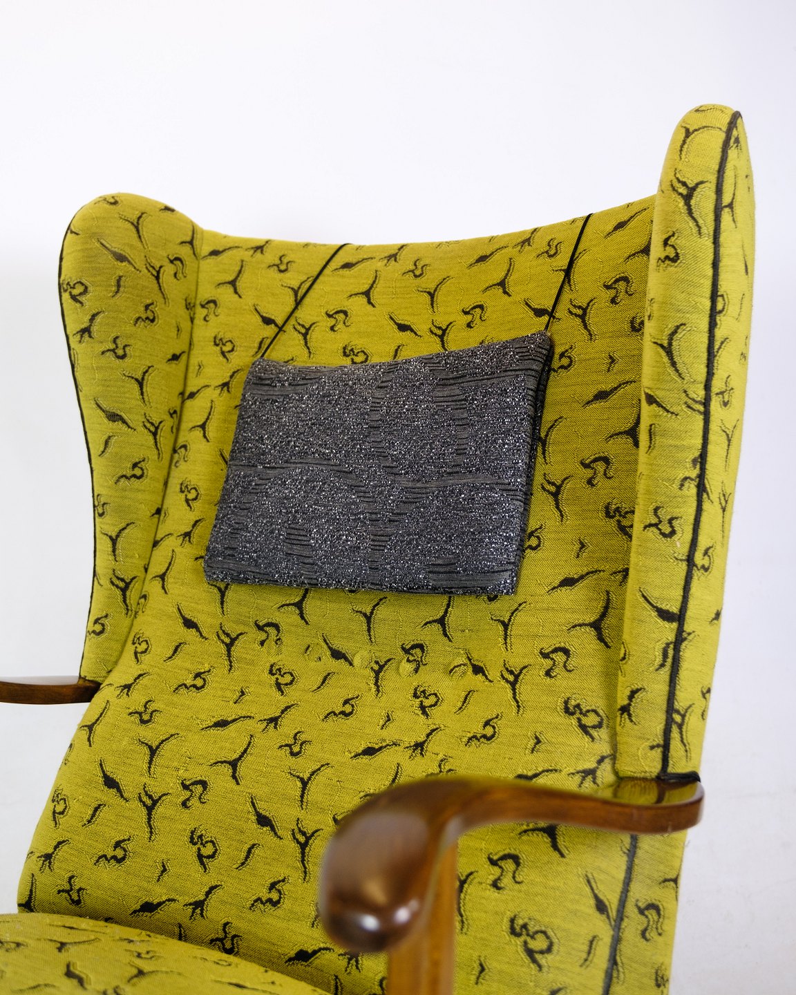 Lænestol af dansk snedkermester i mørkt poleret træ polstret i gråt og gult mønstret stof fra omkring 1940'erne.