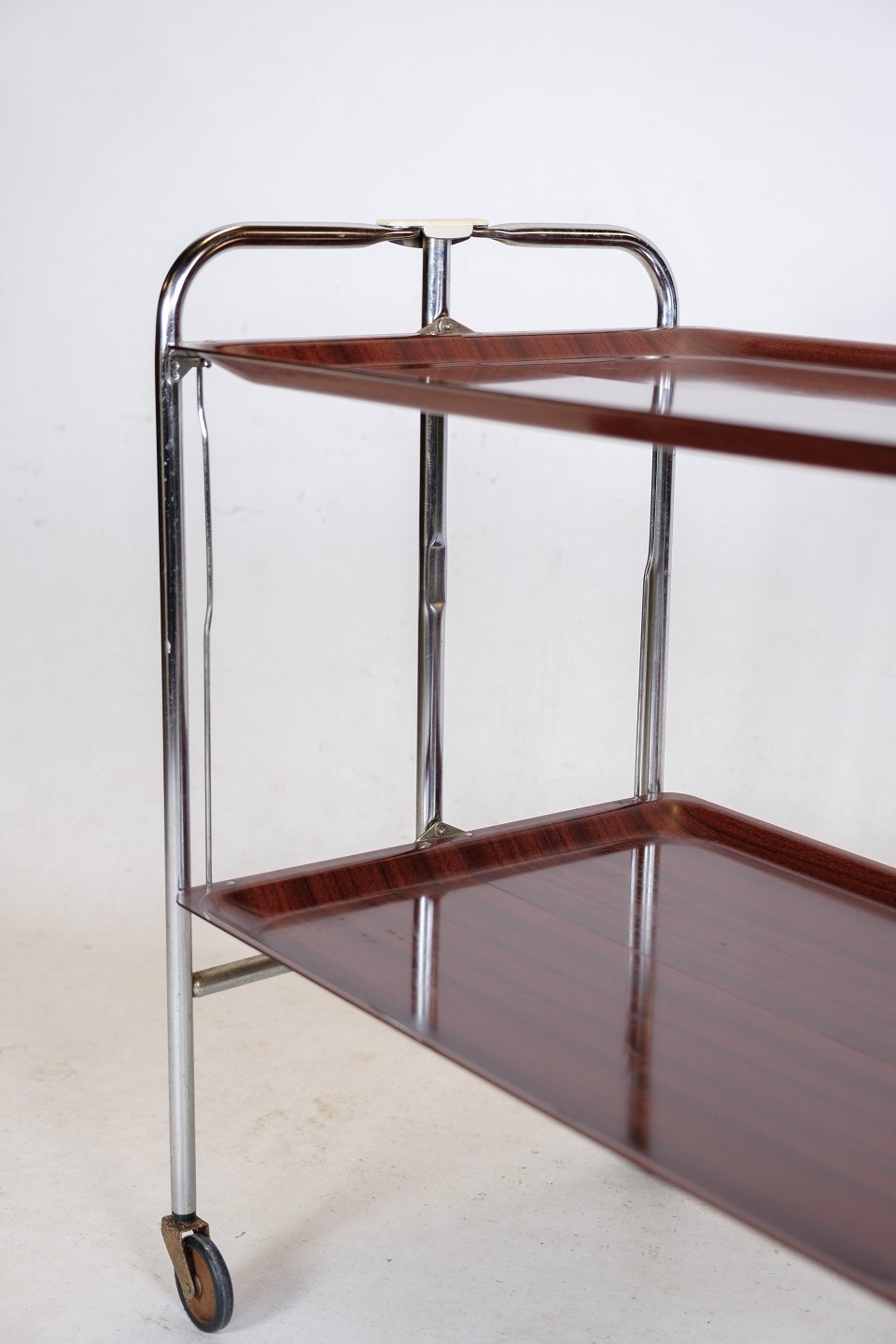 SoldRolling table with imitation mahogni surface with chromed metal frame and original wheels.