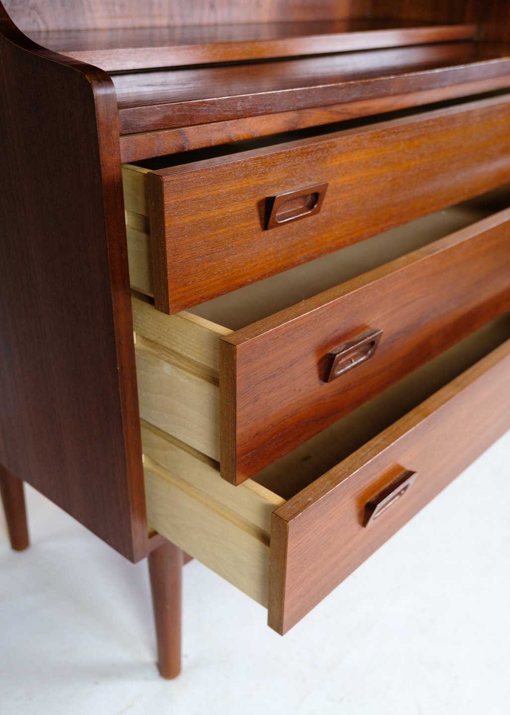 Den kombination af funktionalitet og æstetik, som er karakteristisk for dansk design fra denne æra, er tydeligt til stede i dette møbel. Teaktræets varme farver og naturlige skønhed tilføjer en indbydende atmosfære til ethvert rum, samtidig med at den robuste konstruktion sikrer holdbarheden. Med sin tidløse elegance vil denne teakreol være et smukt og funktionelt tilføjelse til dit hjem.