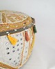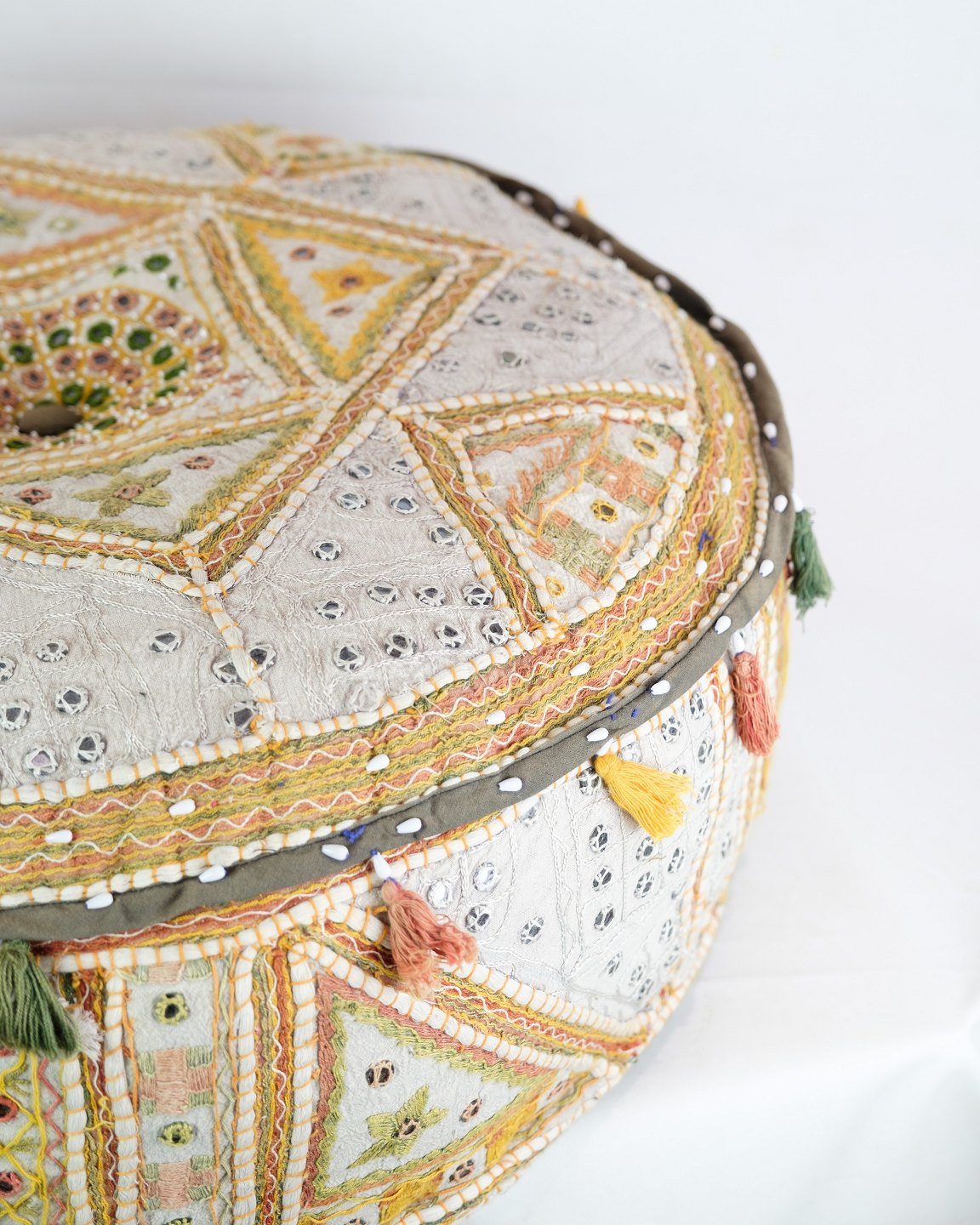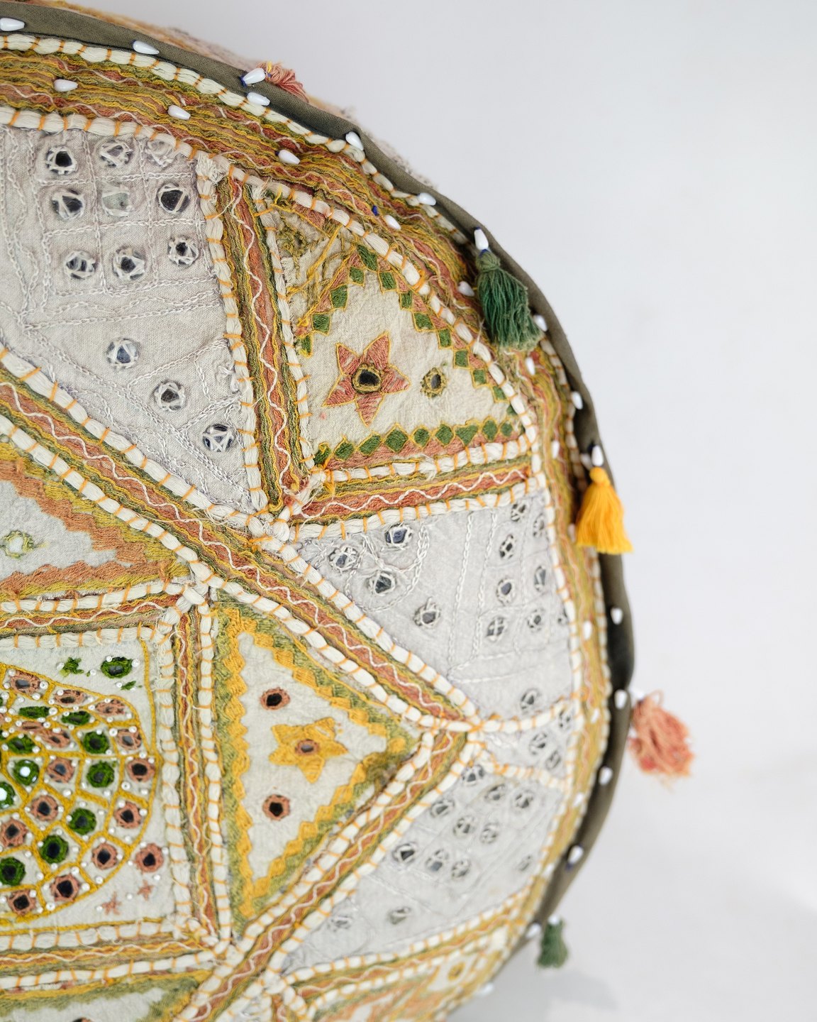 This ottoman of Indian origin is a unique and colorful addition to any home. With its combination of white and yellow colors, it brings a touch of exotic flair and warmth to any room. The handmade quality and the detailed patterns give the pouf an authentic look that reflects Indian craft tradition.