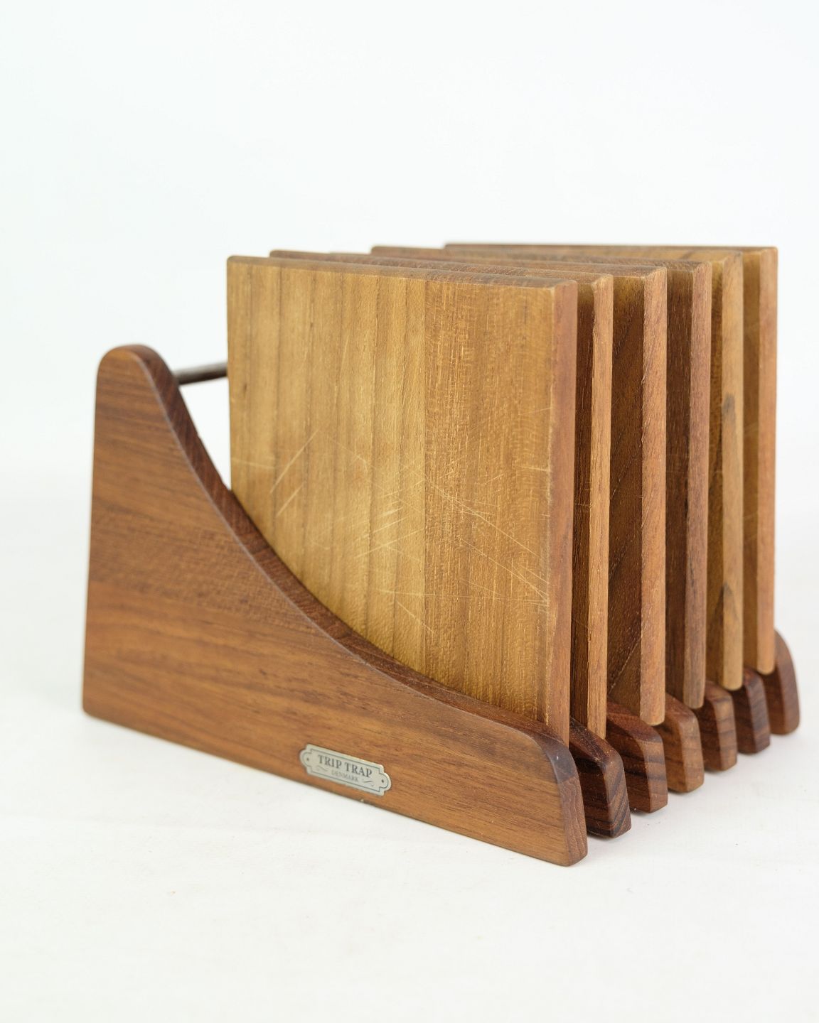 Set of six cutting boards with holders in teak wood by Trip Trap Denmark from around the 1960s.