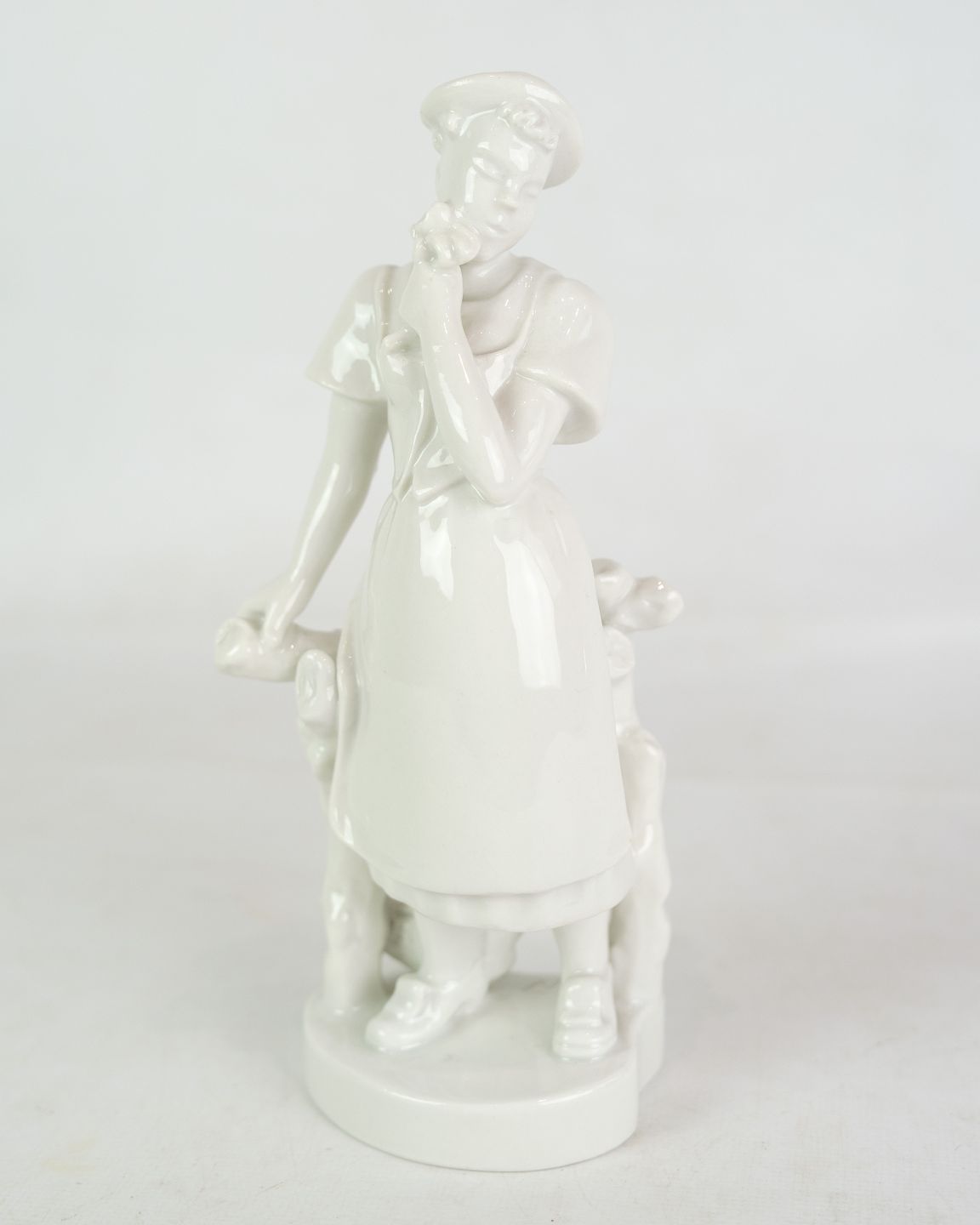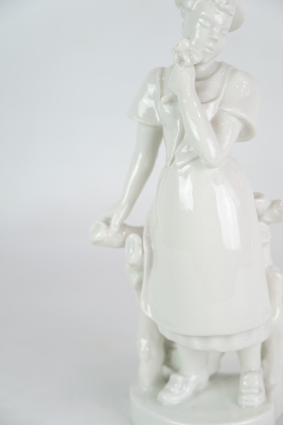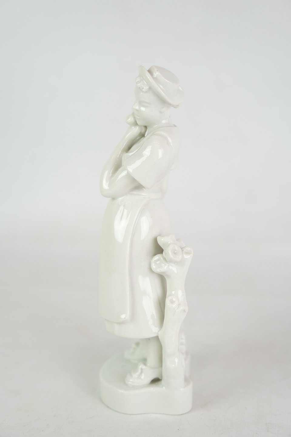 Kgl. figur fra Royal Copenhagen, model 4131, forestillende en pige med blomster og høns, skabt af Bode Willumsen i Blanc de Chine-stil, er et smukt eksempel på dansk keramisk kunst og design.