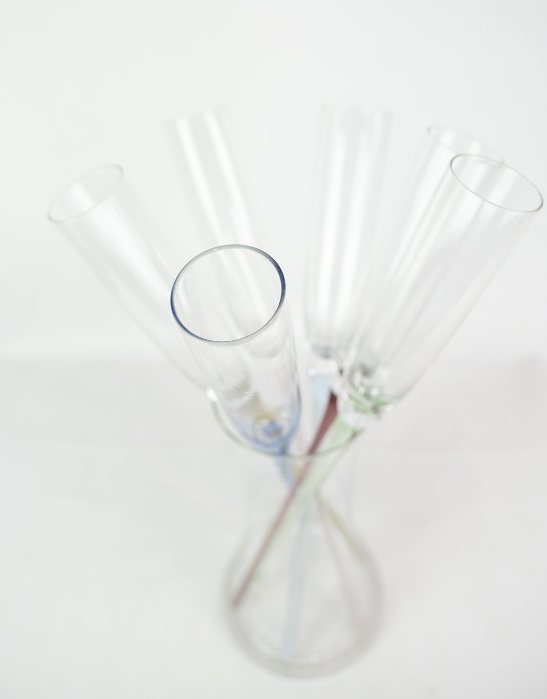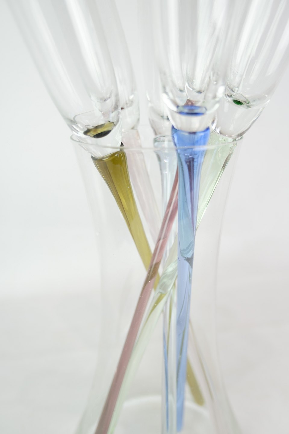 SolgtServerings glas vase med champagne glas på stilk med forskellige farver. Sælges som sæt.
