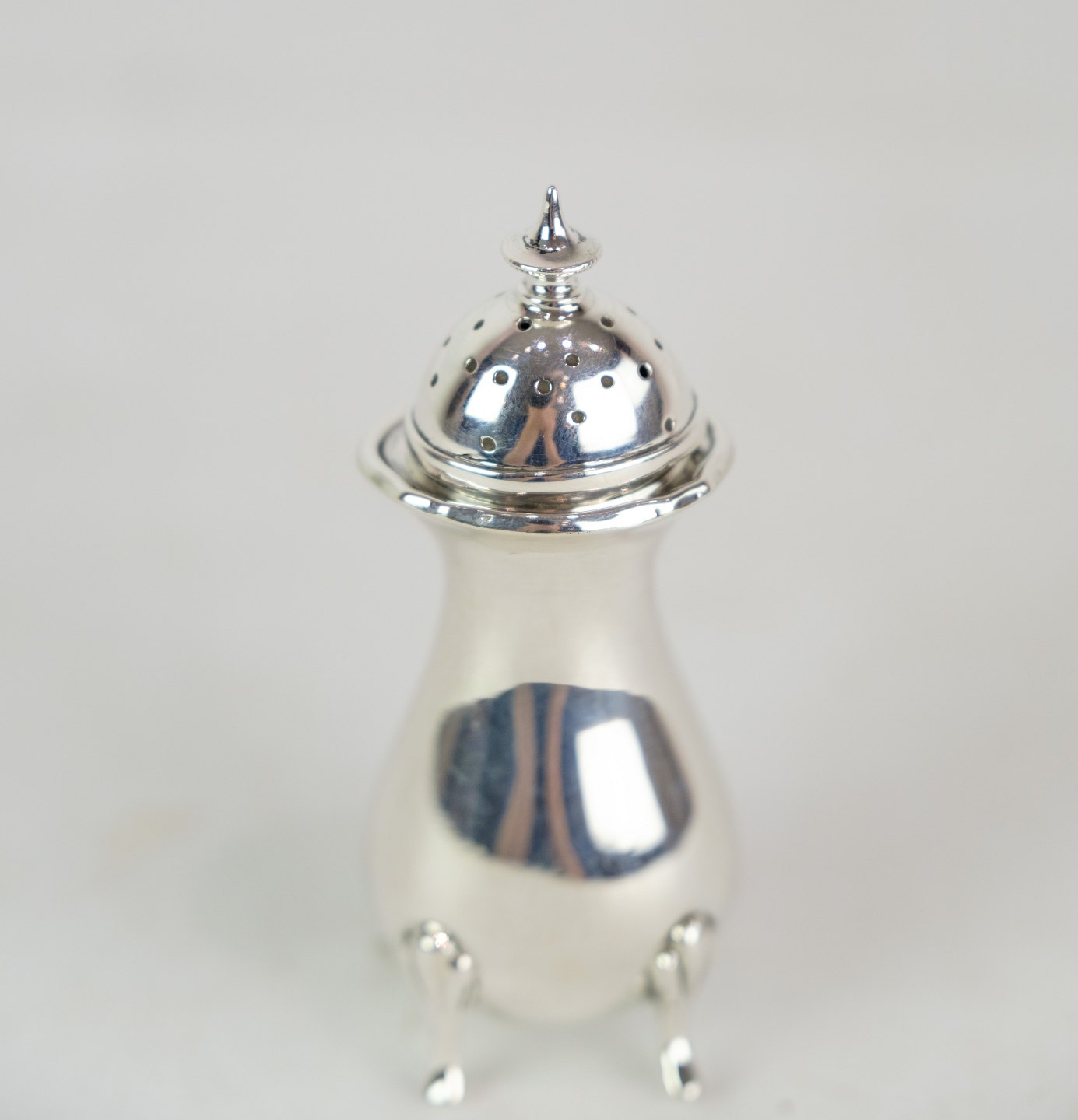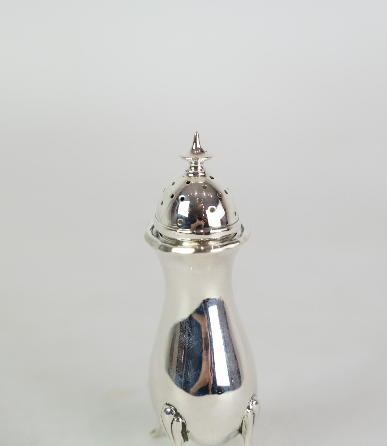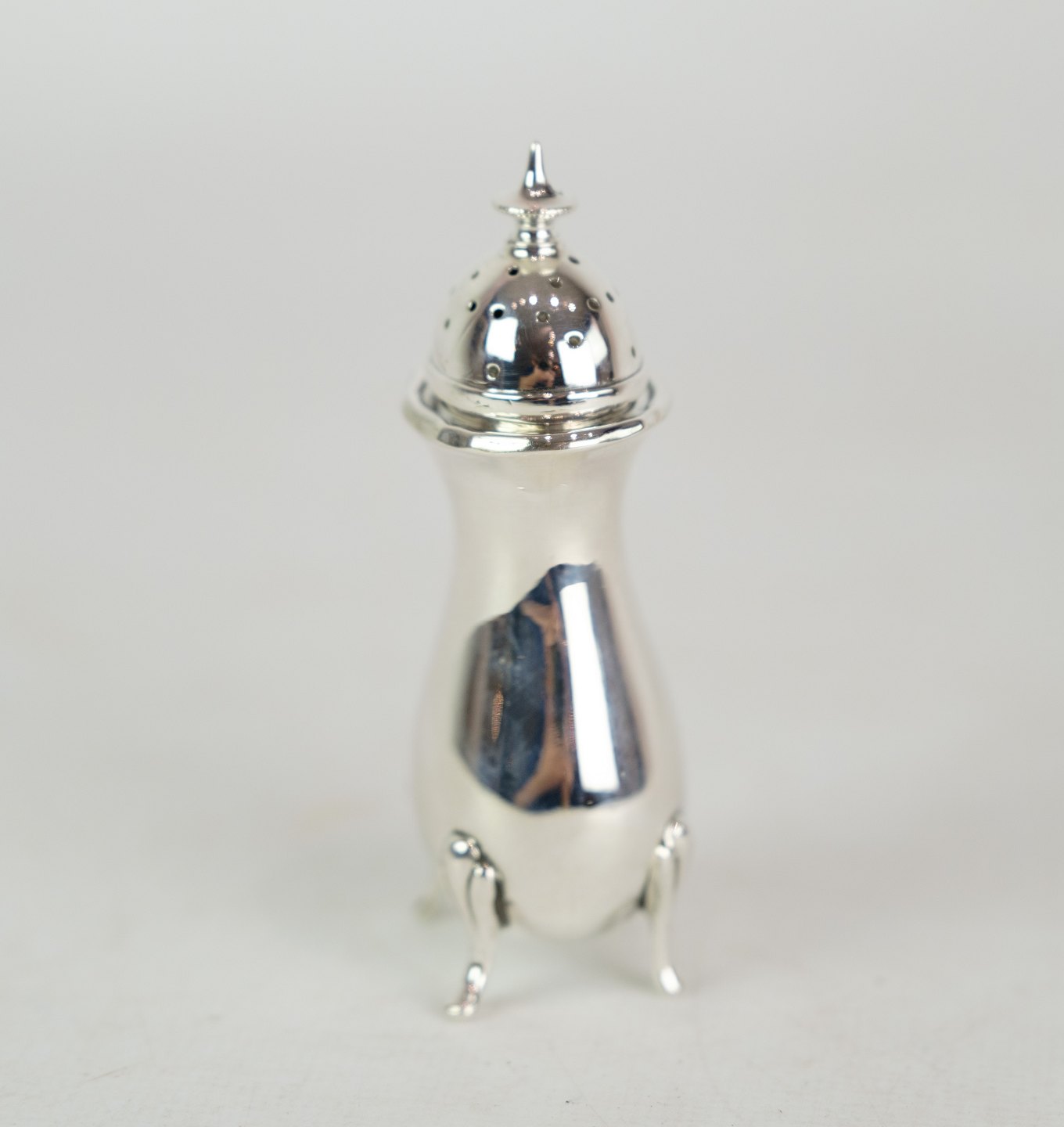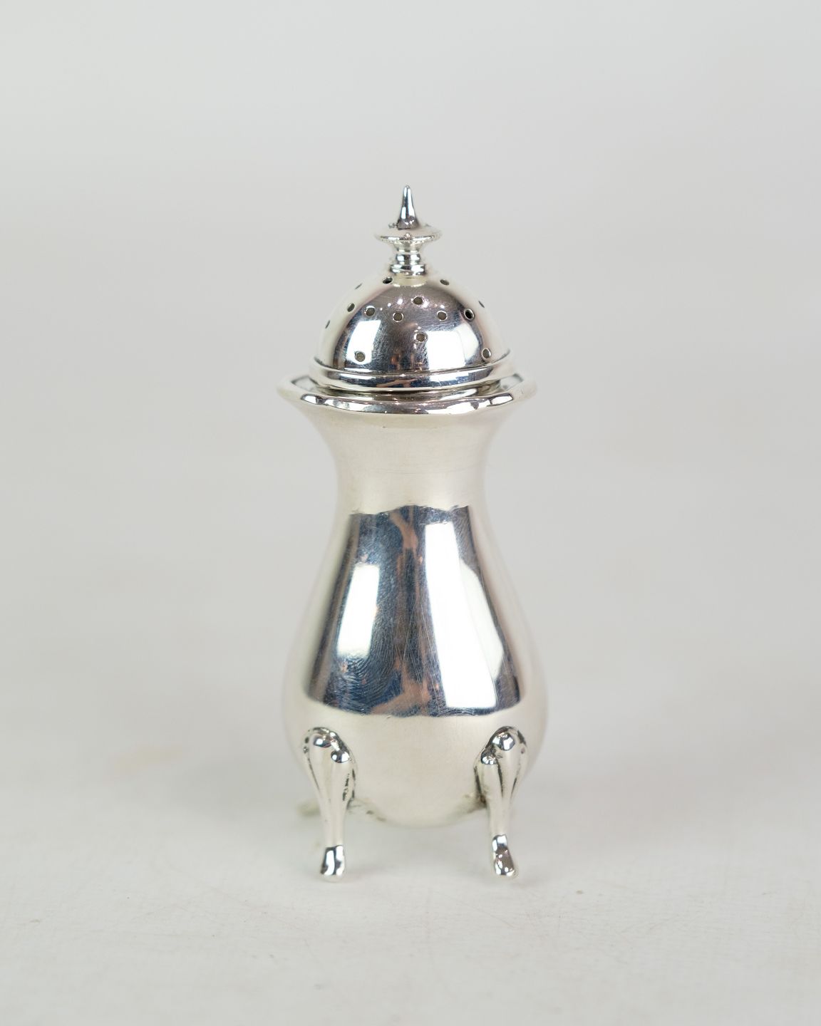 Enkel saltbøsse på fødder, stemplet tretårnet med mesterstempler nummeret 16. Vægt: 38g