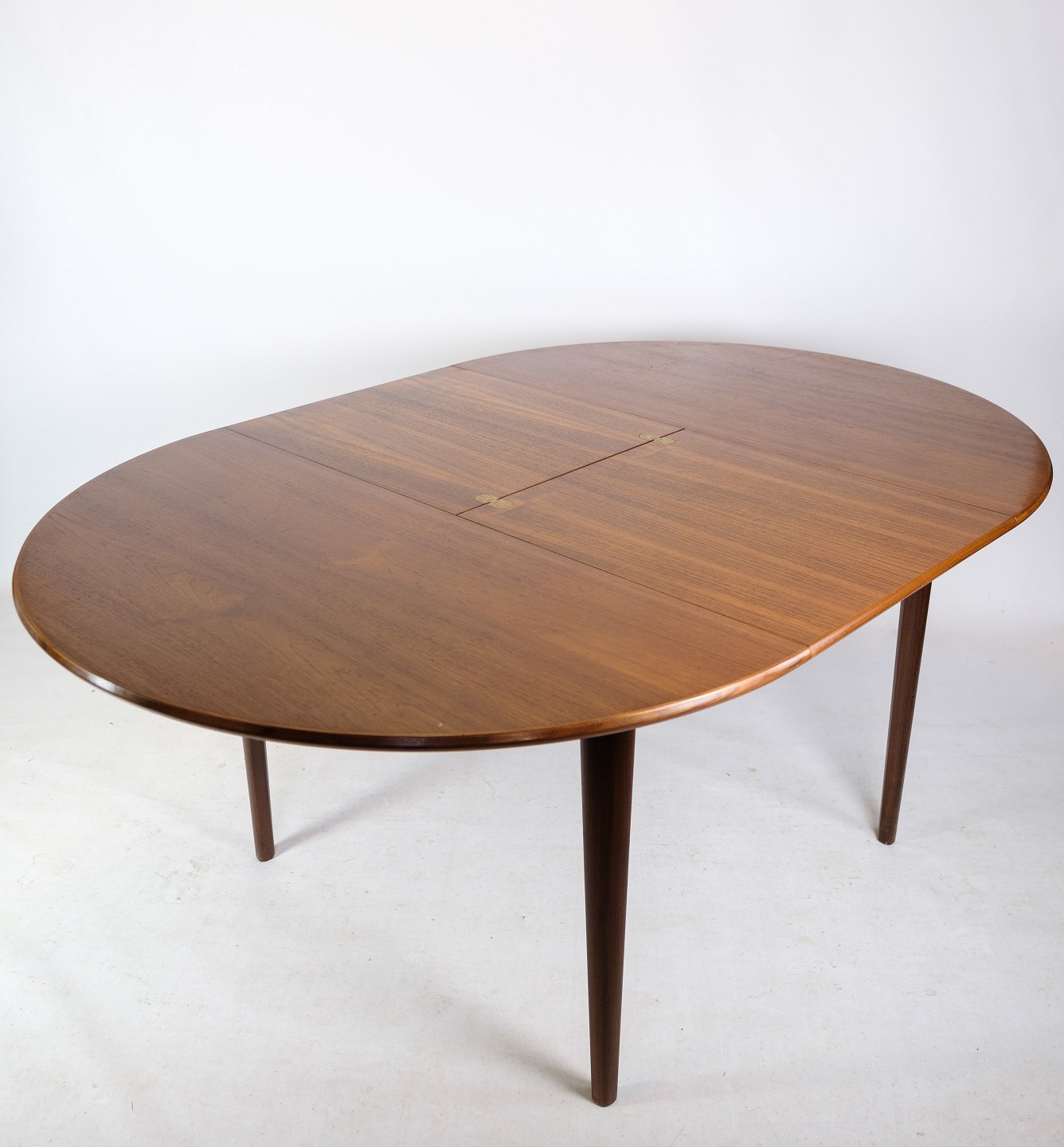 Teak dining table with built-in additional plate and round legs of Danish design from around the 1960s.