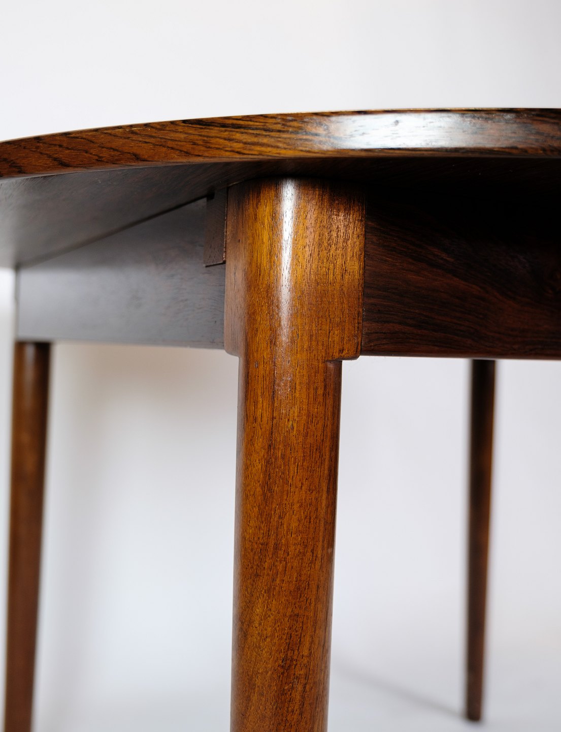 SoldTeak dining table with built-in additional plate and round legs of Danish design from around the 1960s.