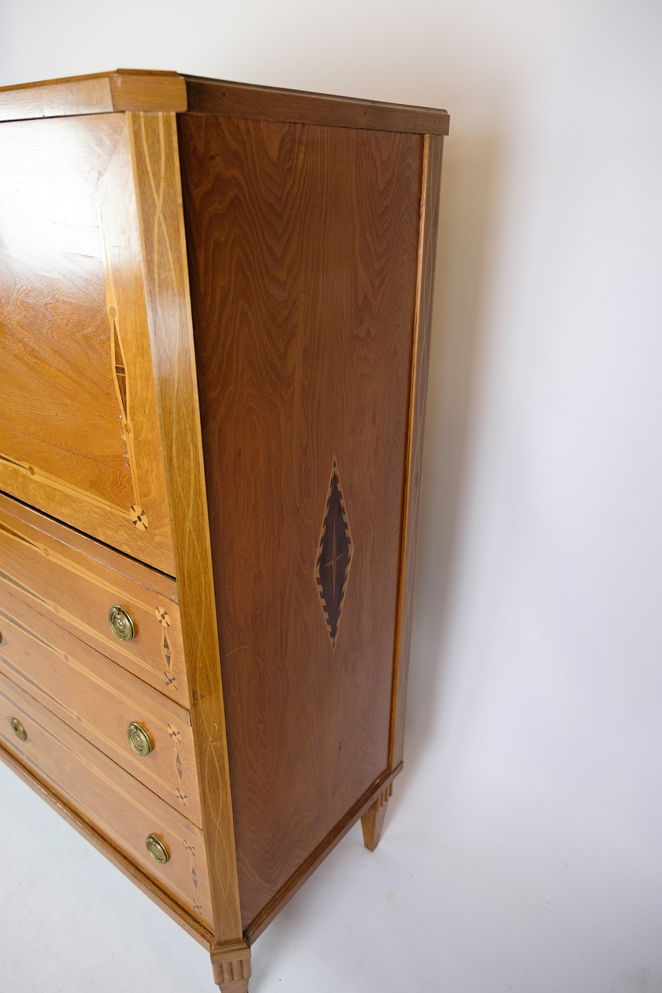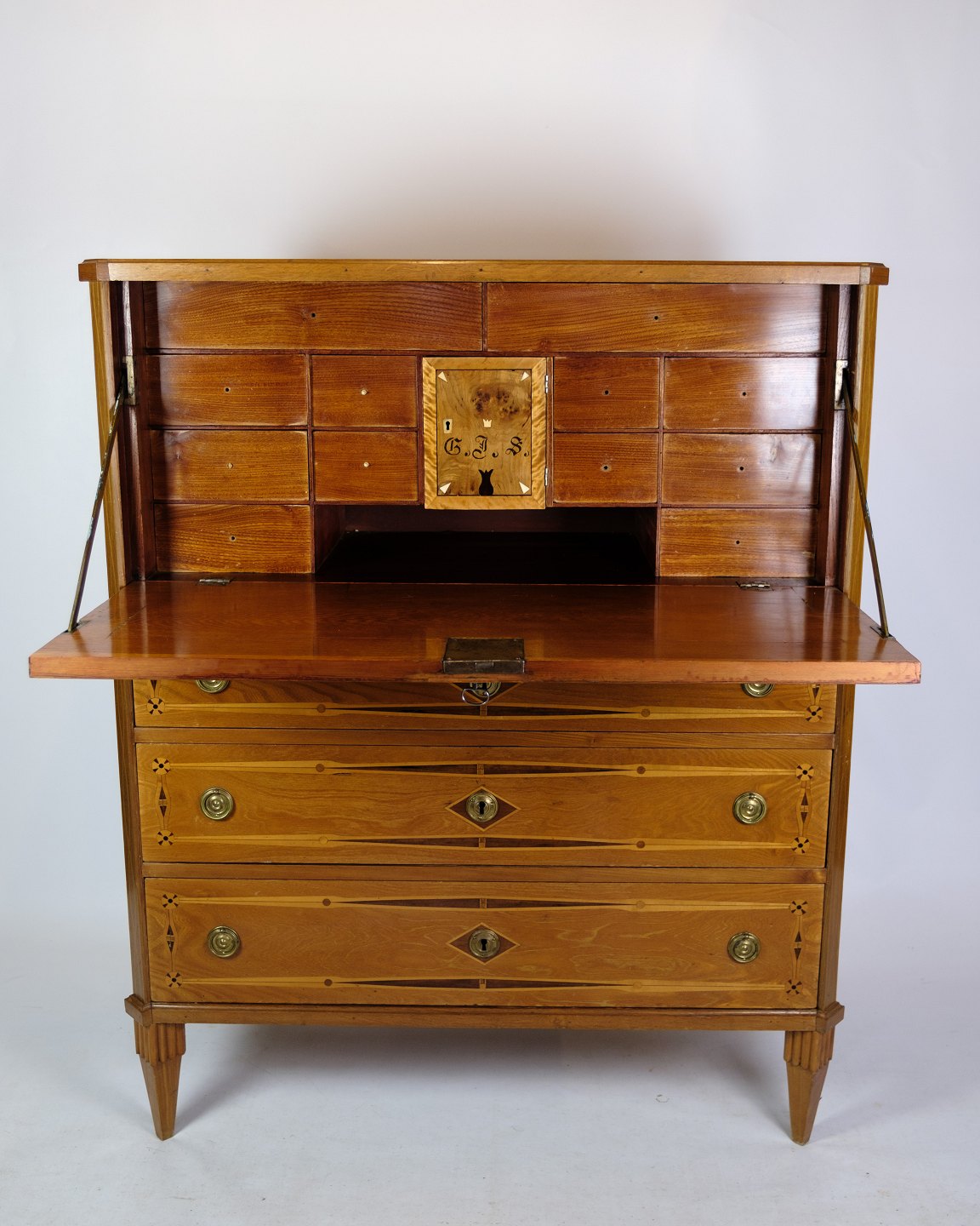 Sekretær af lyst mahogni udsmykket med dekorationer af Intarsia af frugt træ og messing håndtag fra omkring 1810'erne.