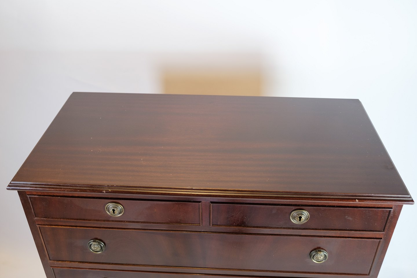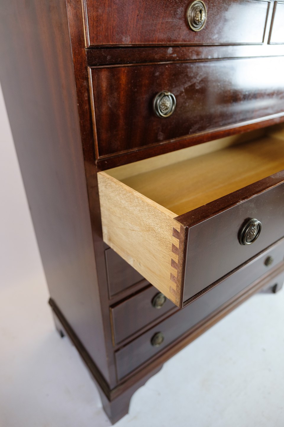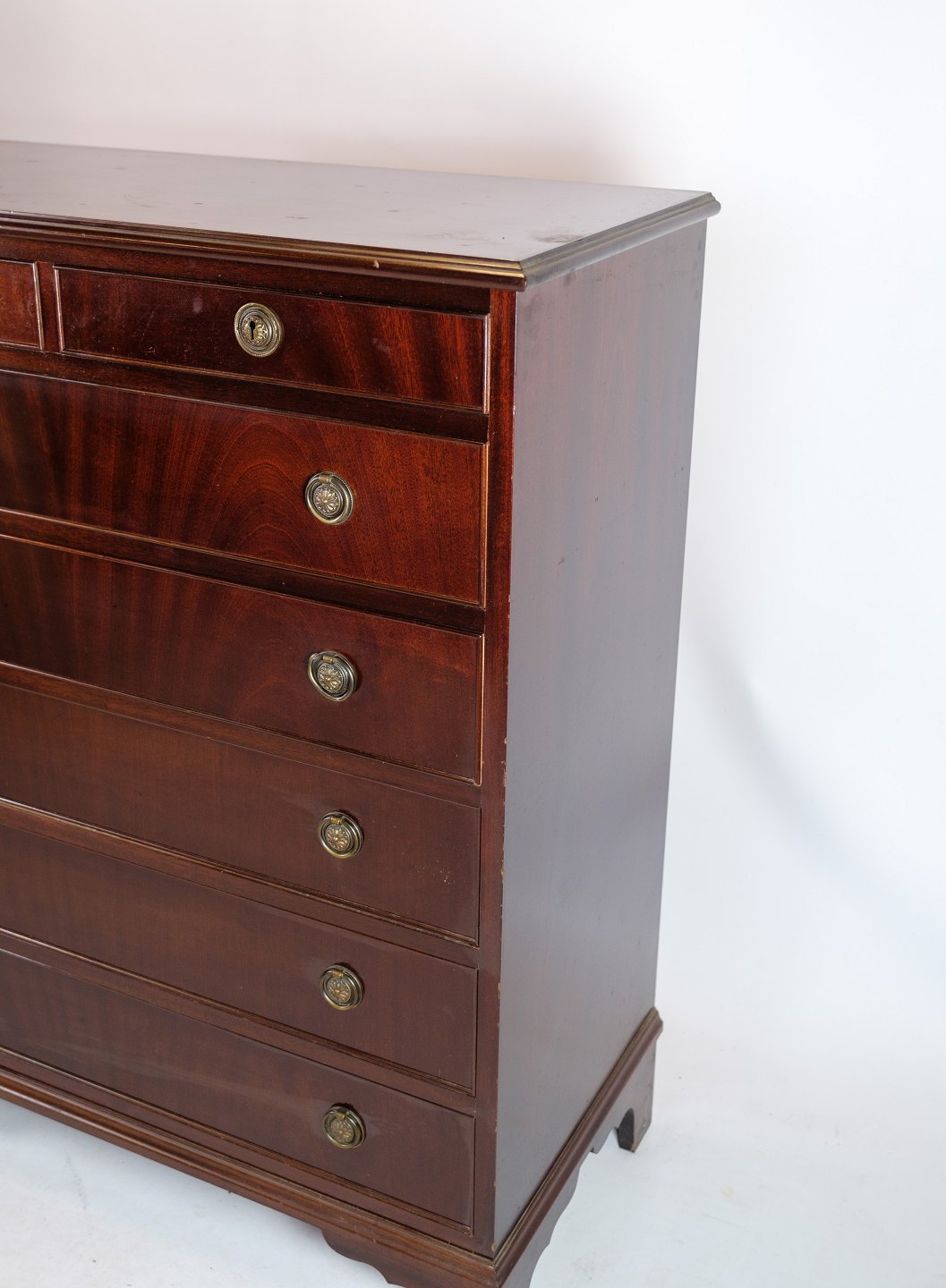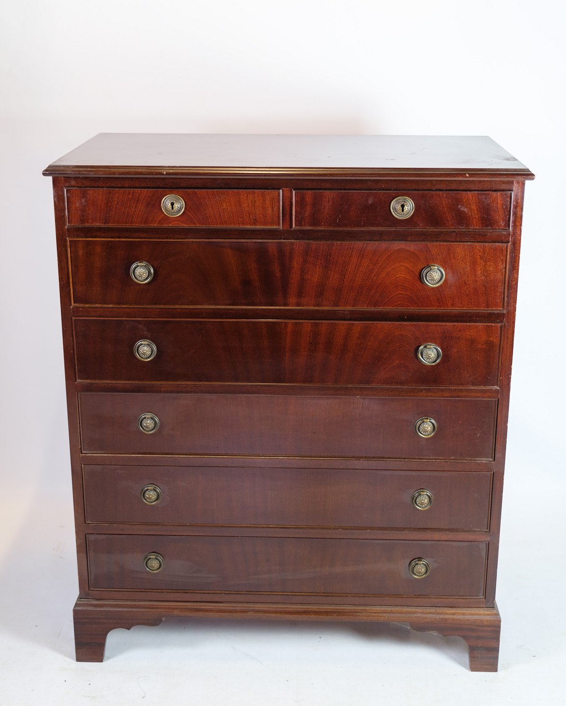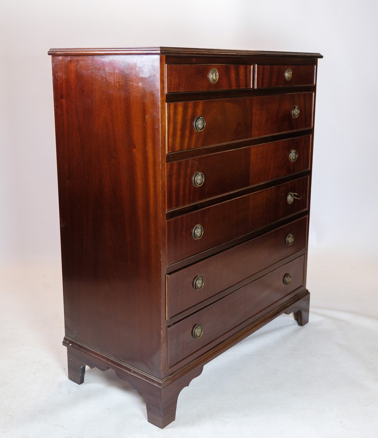 En kommode af poleret mahogni med 7 fra omkring 1930'erne er et fantastisk eksempel på klassisk og elegant møbeldesign fra det sene 1800-tallet udsmykket med smukke messing greb.