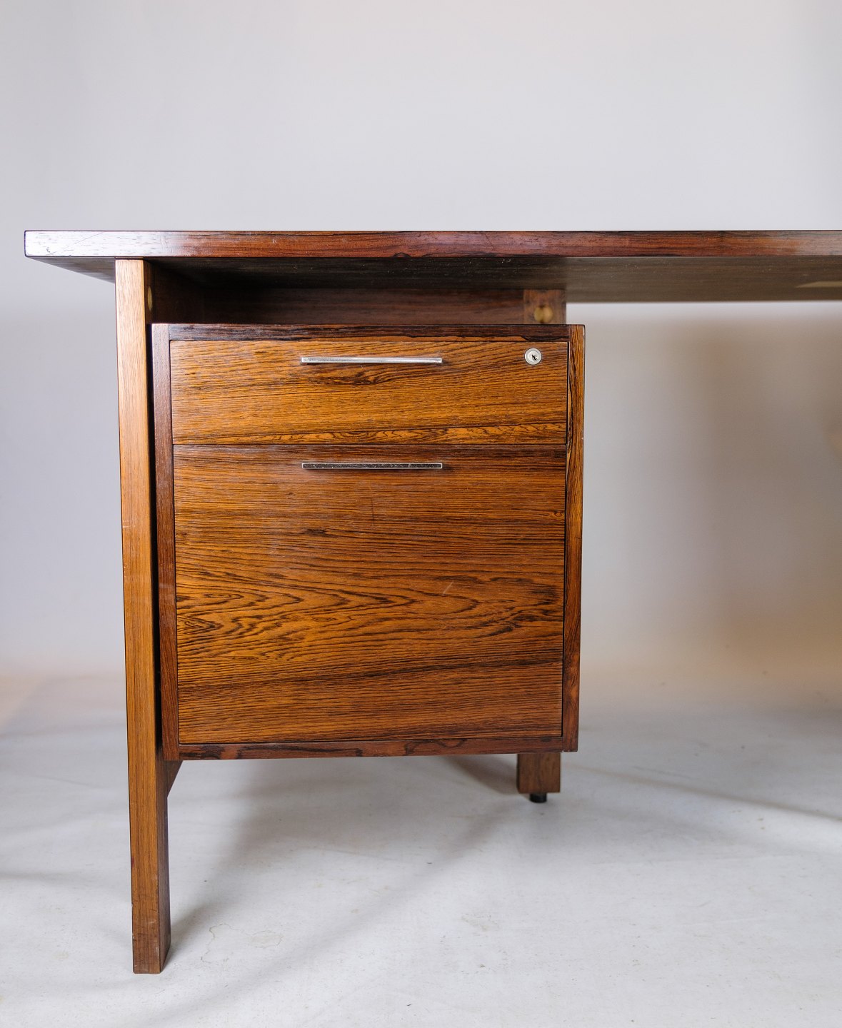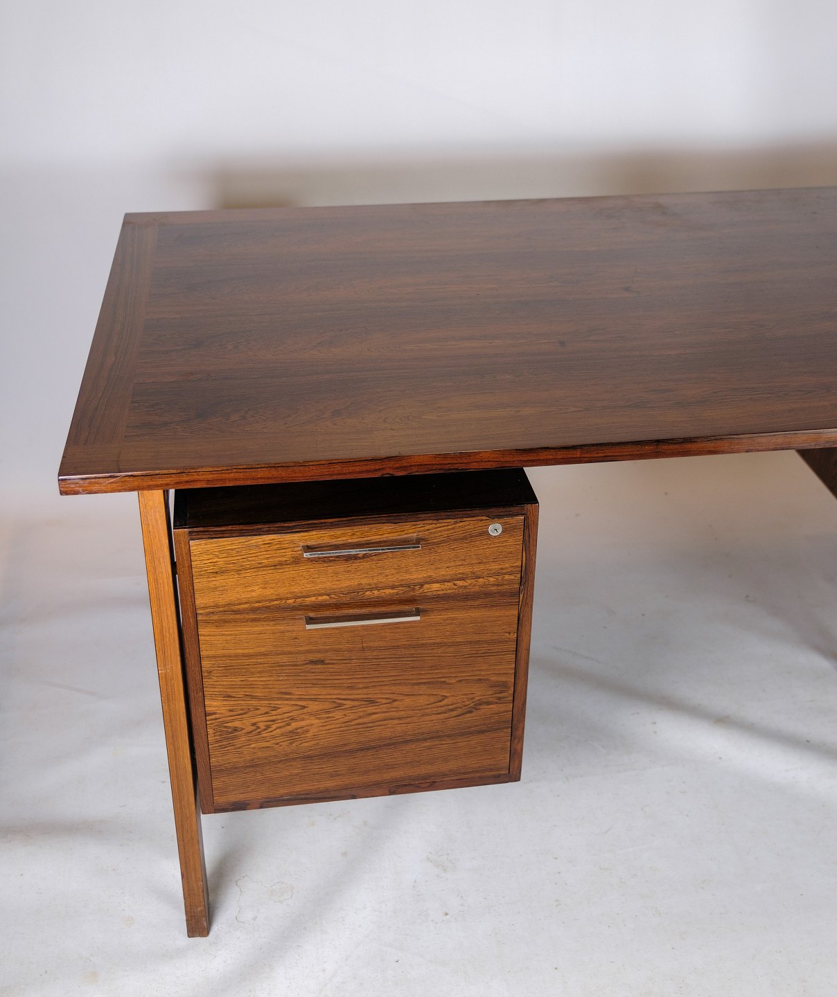 Med sin charmerende og funktionelle udformning tilbyder skrivebordet både skuffer og hylder, hvilket gør det ideelt til opbevaring af dokumenter, kontorartikler og andre nødvendigheder. Den rige farve og struktur i palisandertræet tilføjer desuden en varm og luksuriøs følelse til ethvert arbejdsområde.