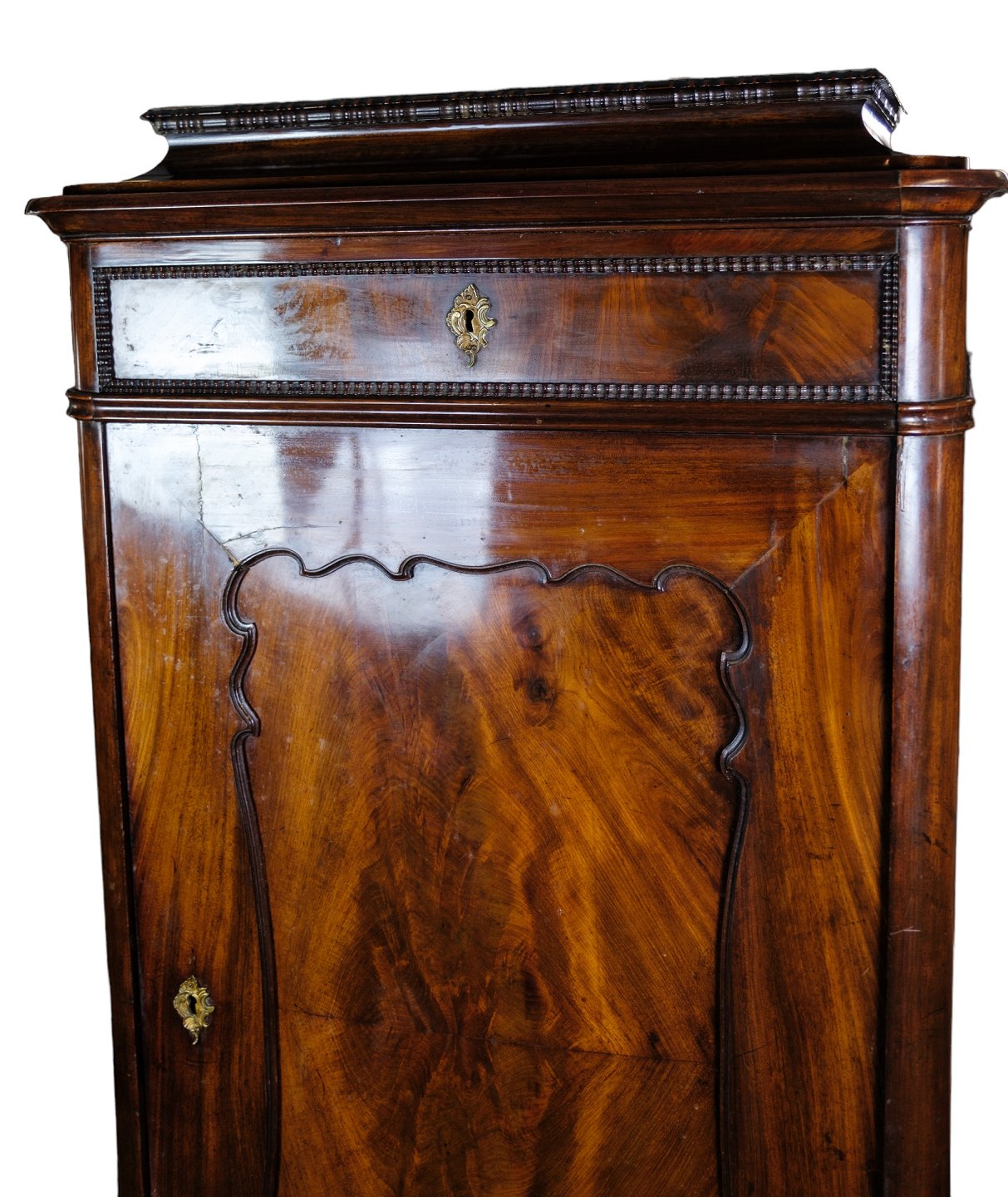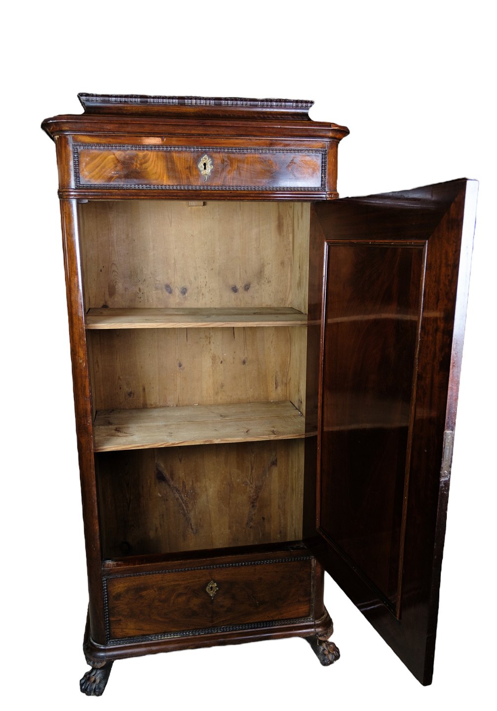 Højt skab af poleret mahogni i flot antik stand med 2 skuffer og en låge med hylder fra 1850erne.