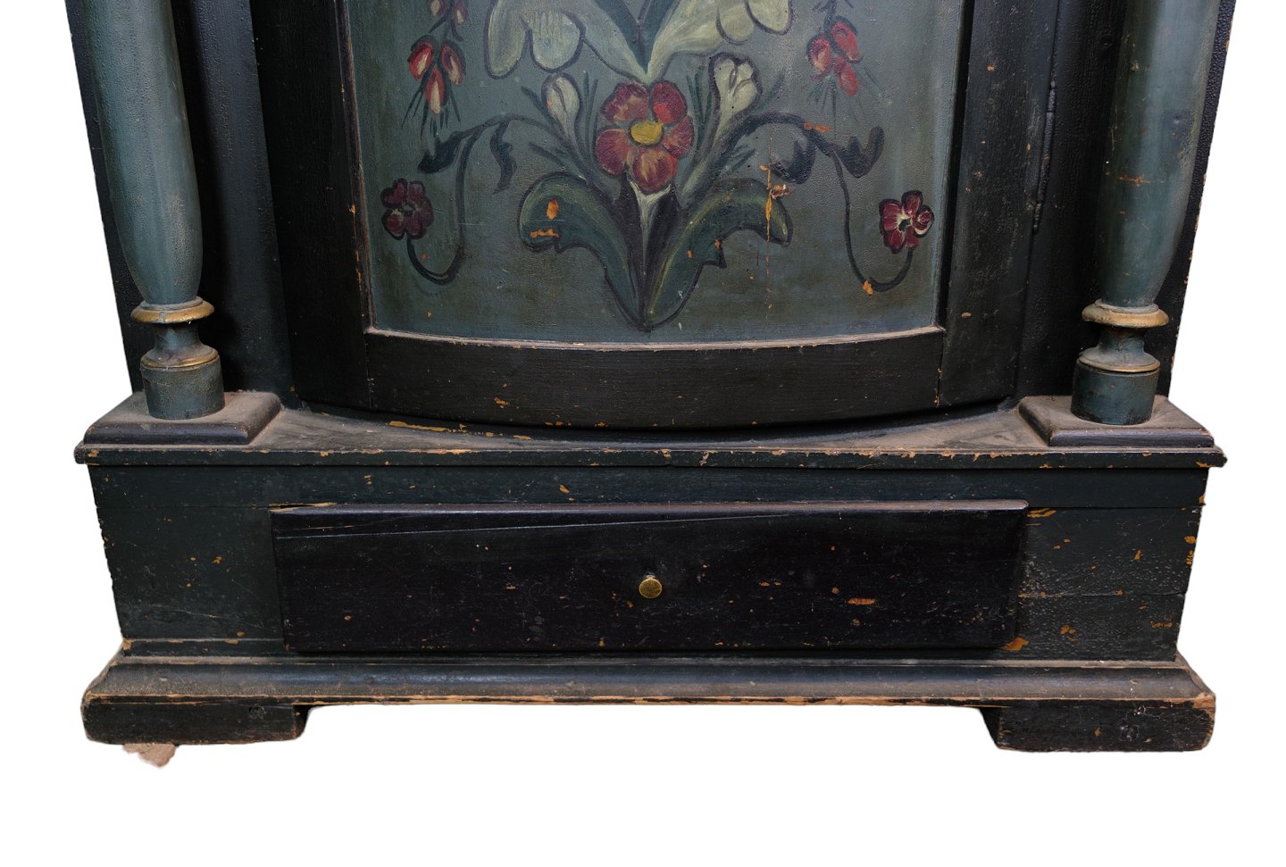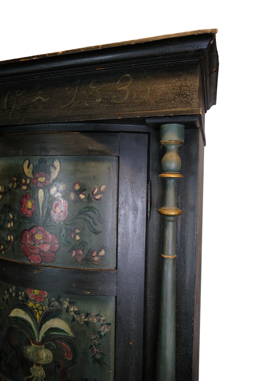 Painted Hedebo cabinet (Roskilde cabinet) with columns and floral decoration with door and interior shelves from the year 1836.