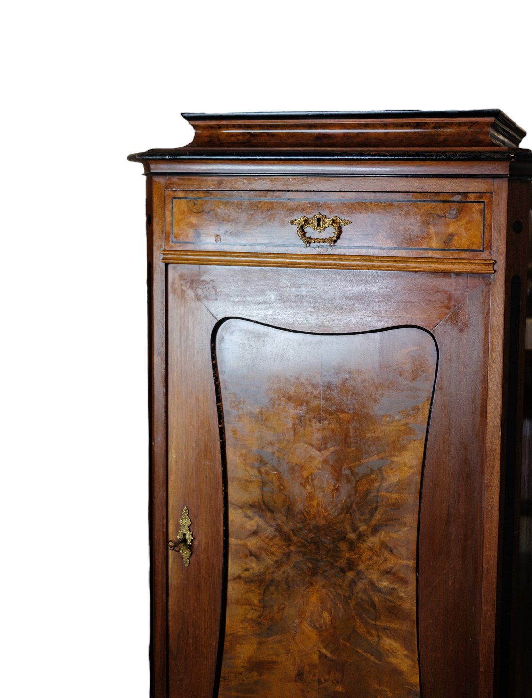 Højt skab af poleret valnød flot antik stand med 2 skuffer og en låge med hylder fra 1850'erne