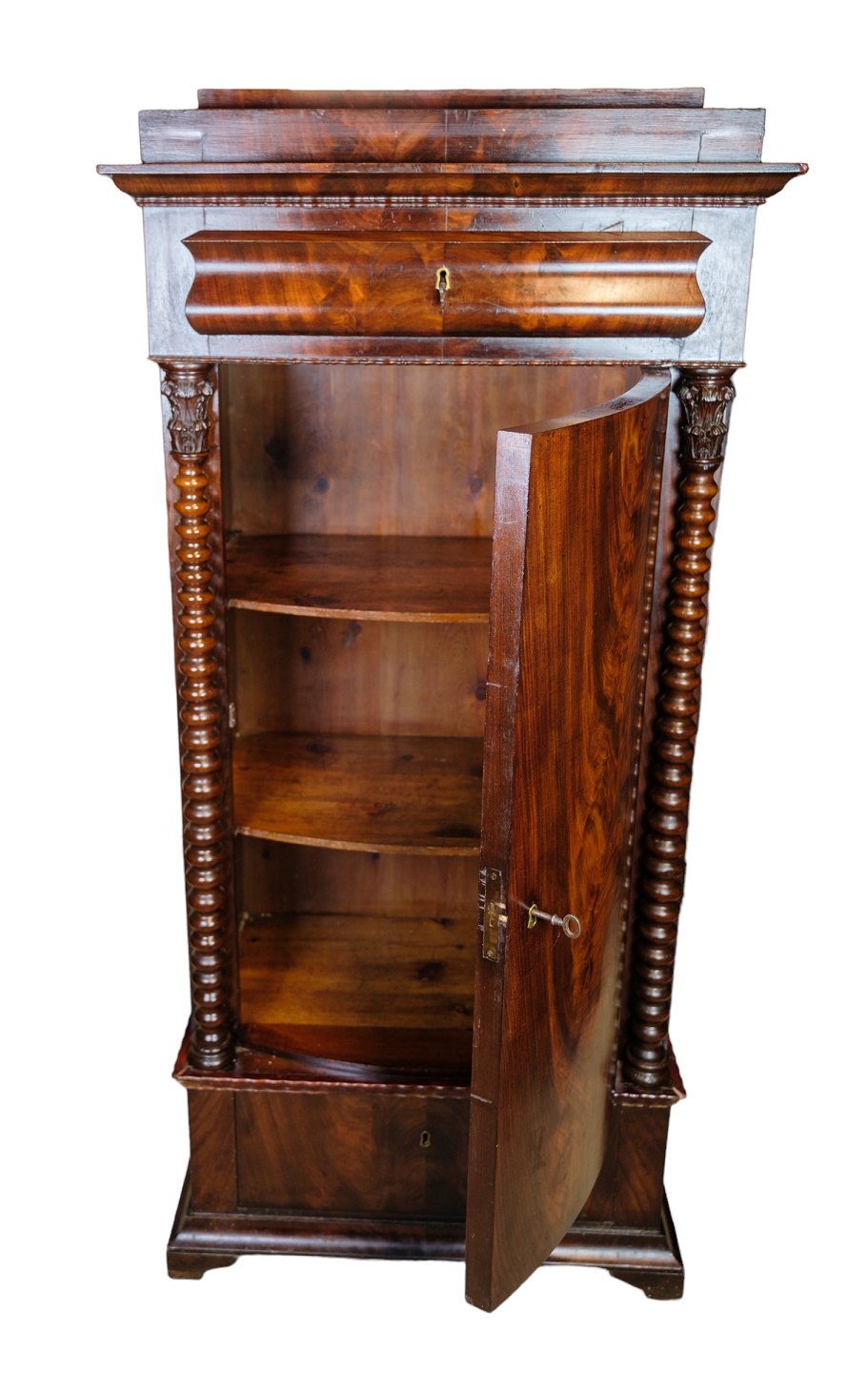 SolgtSen empire piedestalskab af poleret mahogni med skuffe i toppen og bunden fra omkring 1840