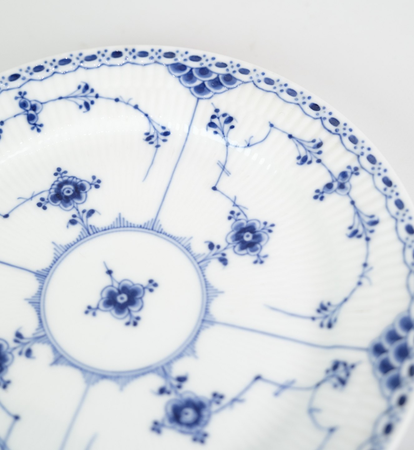 Royal Copenhagen's Musselmalet Riflet Serveringsfad med nummer 1/100 er et elegant og tidløst stykke porcelæn, der tilføjer en fornemmelse af tradition og skønhed til din borddækning.