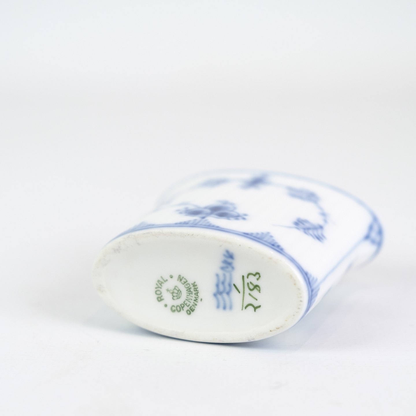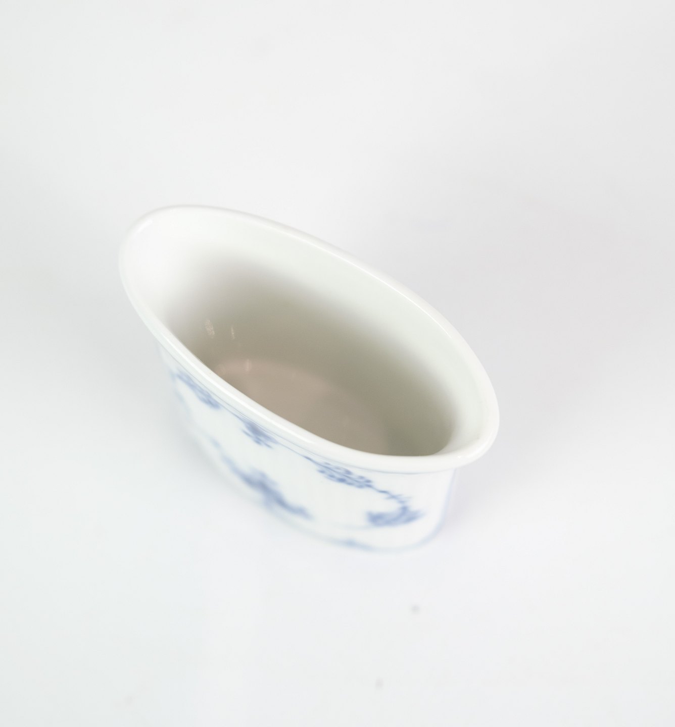 SolgtRoyal Copenhagen's Musselmalet Riflet ovalt bæger/lille vase med dekorationsnummer 1/2183 er en smuk og alsidig genstand, der udstråler klassisk elegance.