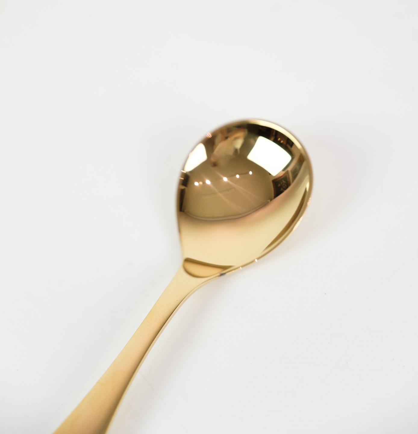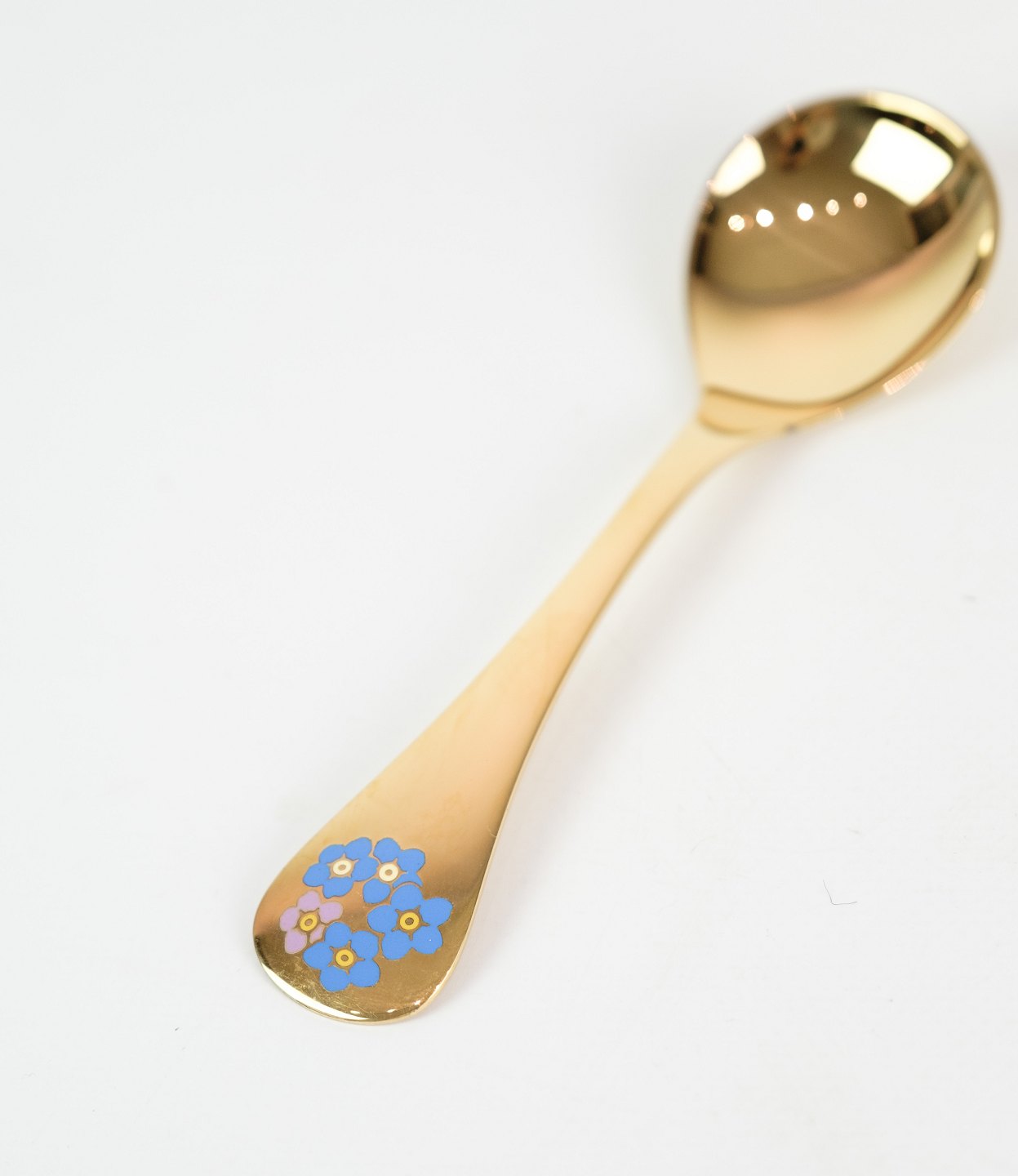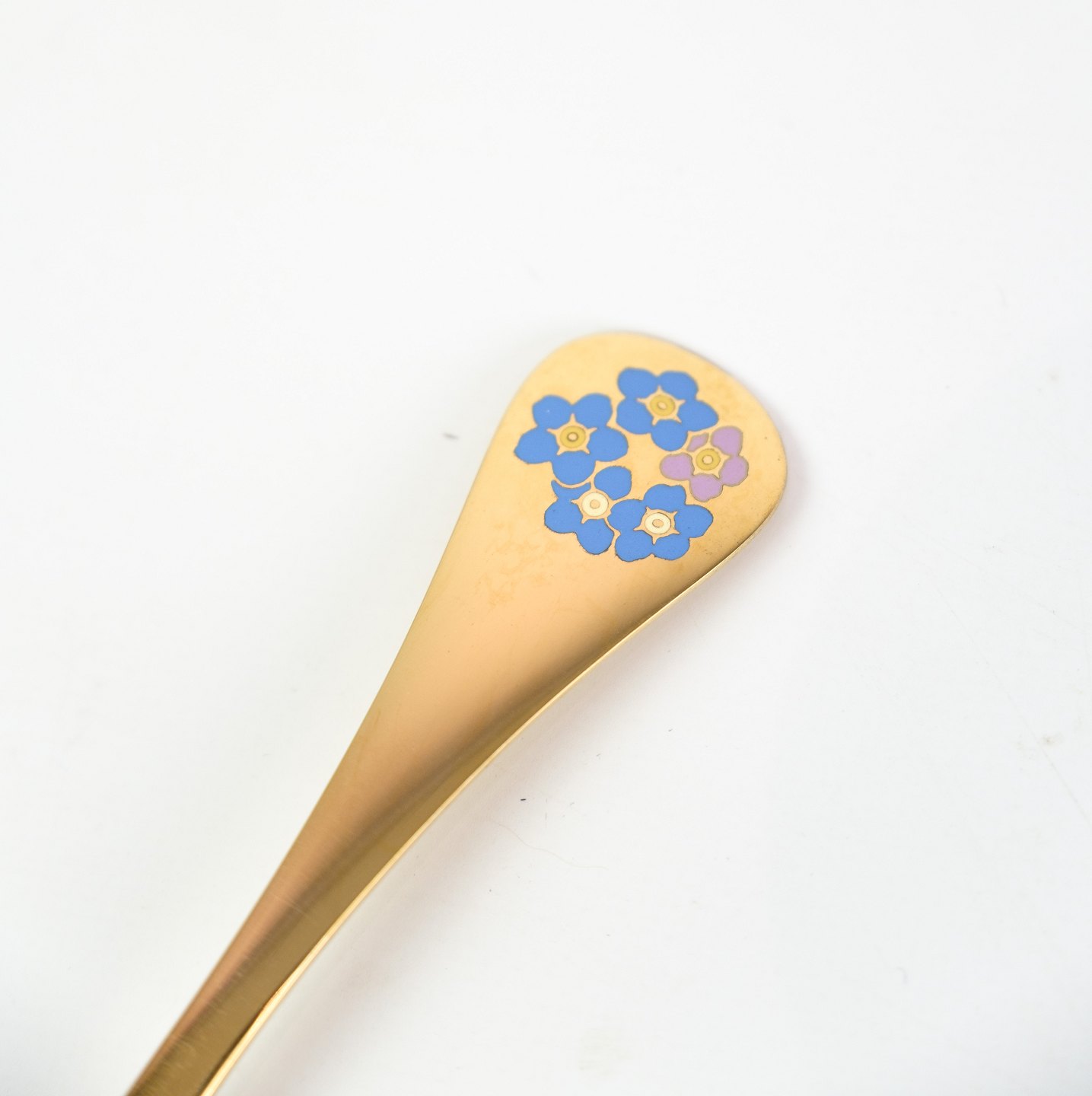 Georg Jensen Annual spoon with motif of a flower called Forget-me-not from year 1983 is made of gold-plated sterling silver. Designed by renowned Danish silversmith Georg Jensen, this elegant and beautiful silver flatware is a wonderful addition to any luxury flatware collection.
