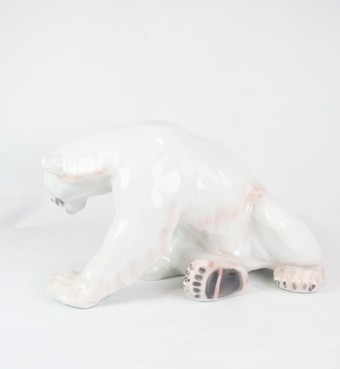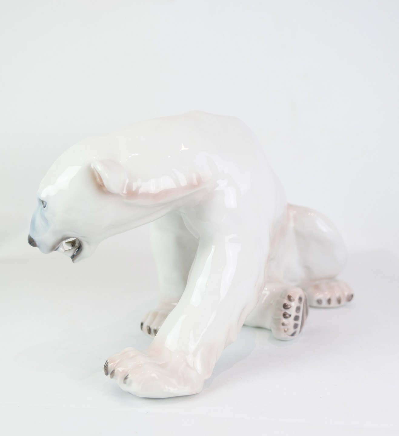 SoldBing & Grøndahl (B&G) The Polar Bear with number 1857, also known as "Big Polar Bear" or "Knud Kyhn Polar Bear," is an impressive porcelain figure designed by the renowned Danish ceramist Knud Kyhn. This figure is often related to Bing & Grøndahl and Royal Copenhagen, as Royal Copenhagen later took over Bing & Grøndahl.