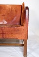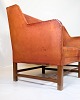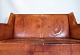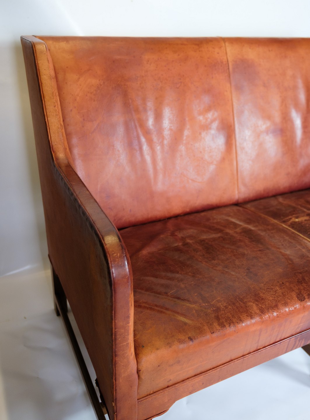 The vintage design two-seater sofa model 5011 created by Kaare Klint. This iconic piece is crafted in original cognac leather and features a distinctive six-legged mahogany base. The sofa gained recognition after being showcased at the Copenhagen Cabinetmakers' Guild exhibition in 1935, highlighting its significance in the history of Danish modern design.