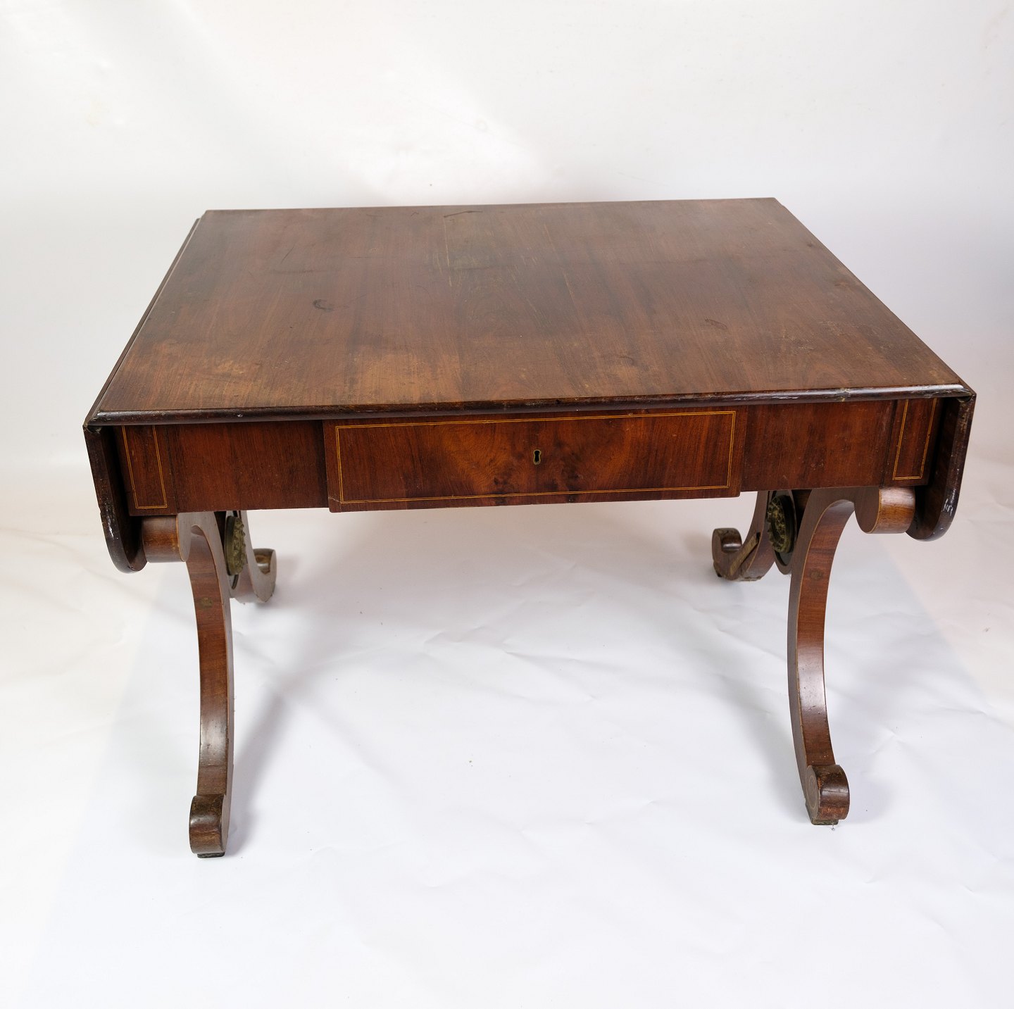 Spisebord af mahogni med klapper og messing udsmykning, samt en skuffe med nøgle fra omkring 1860'erne.