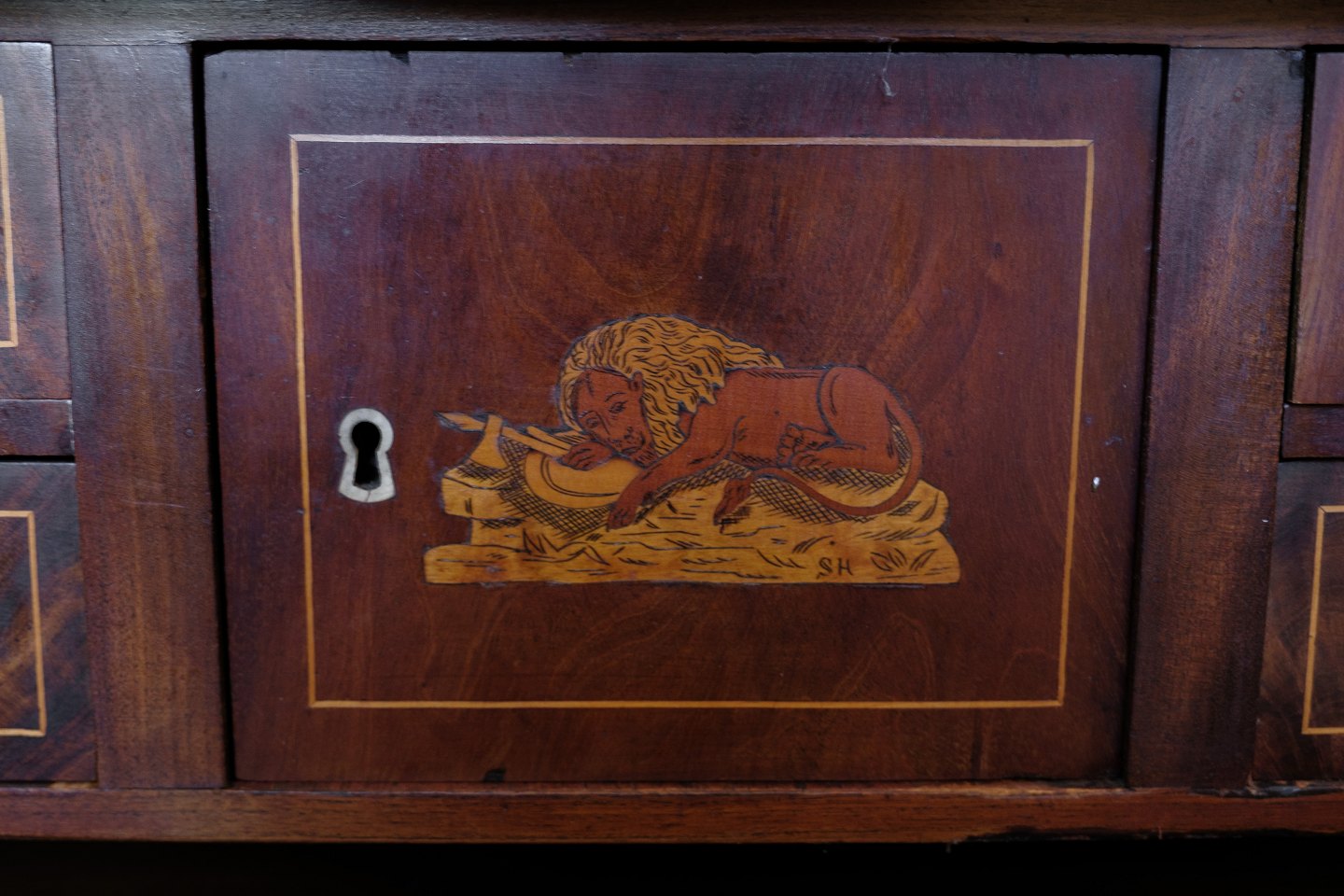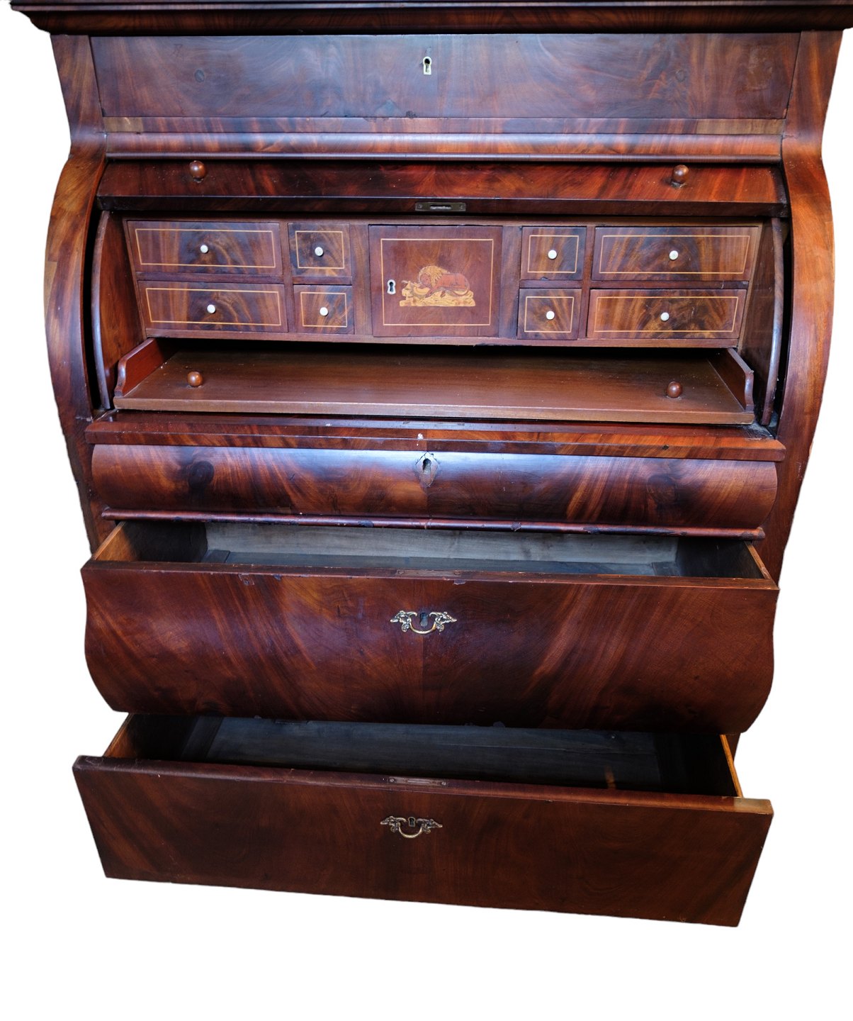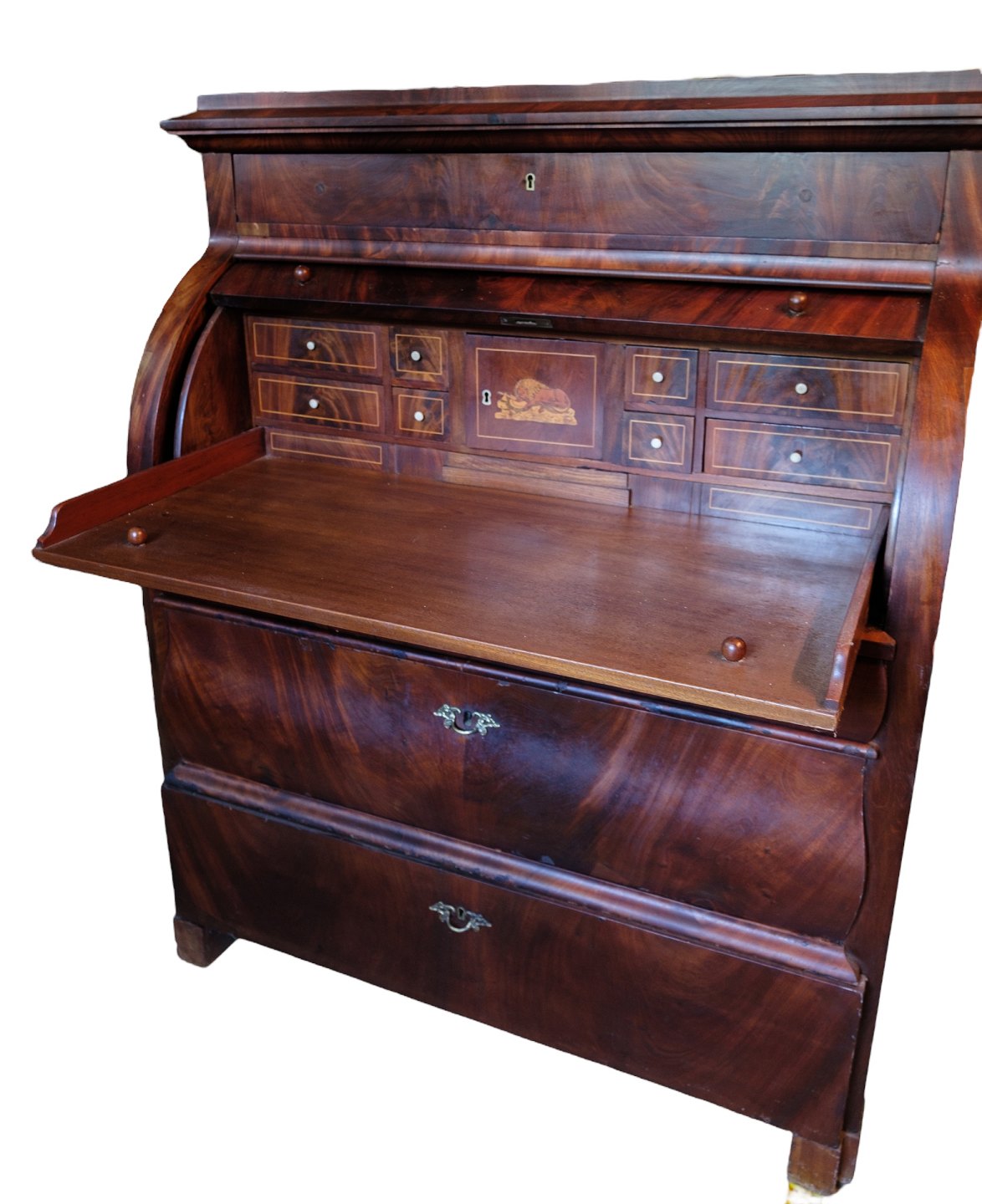 Chatol af Mahogni med fire skuffer og indvendig intarsia fra omkring år 1820'erne.