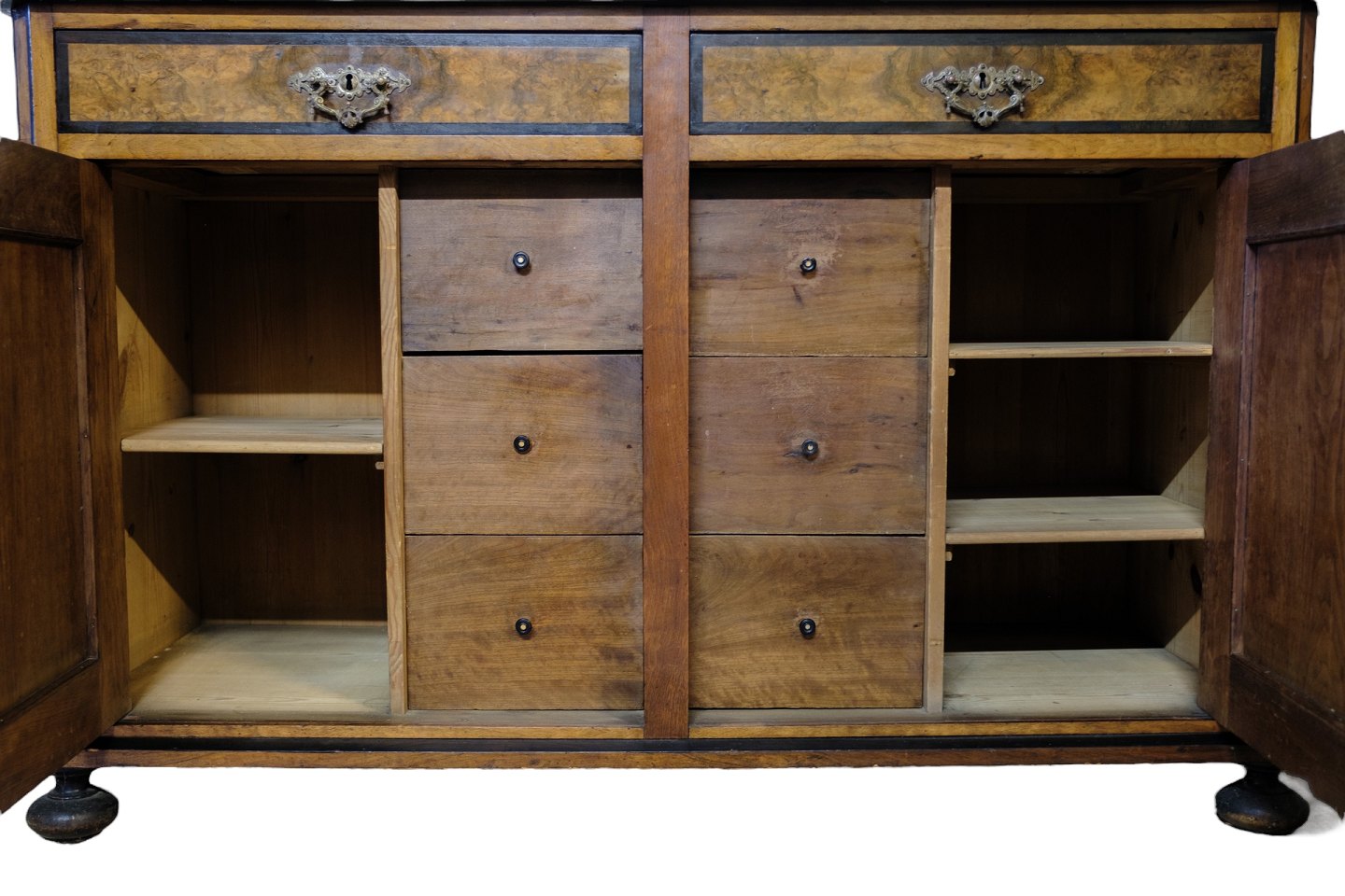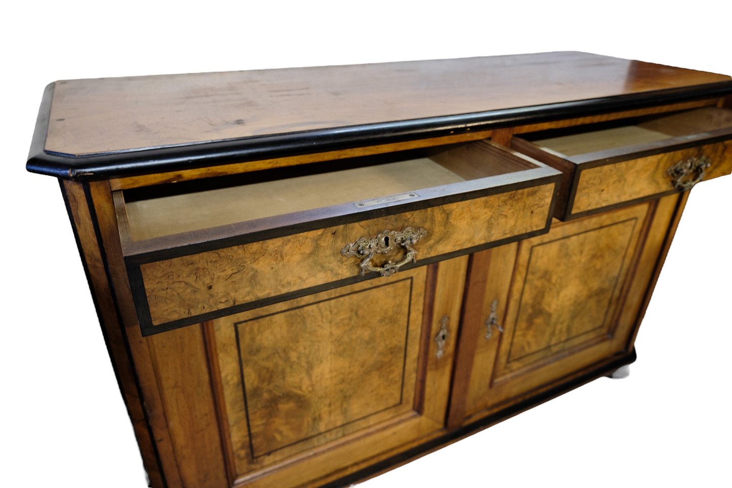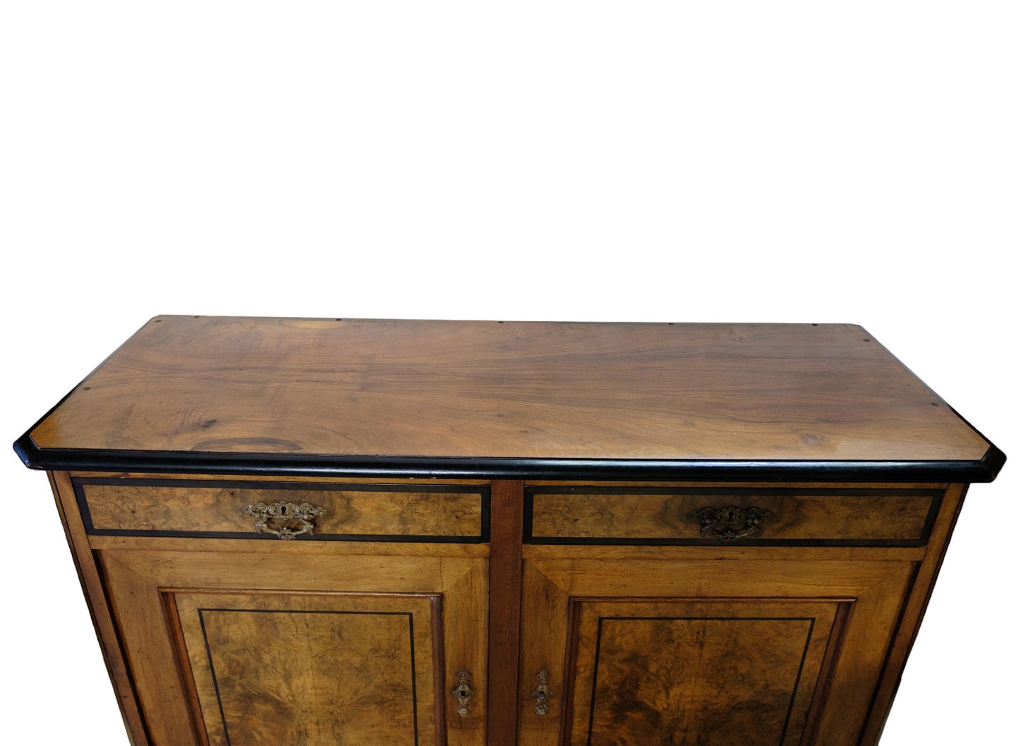 Skænk af lys mahogni med 2 låger og 2 skuffer og runde ben fra omkring 1920'erne.