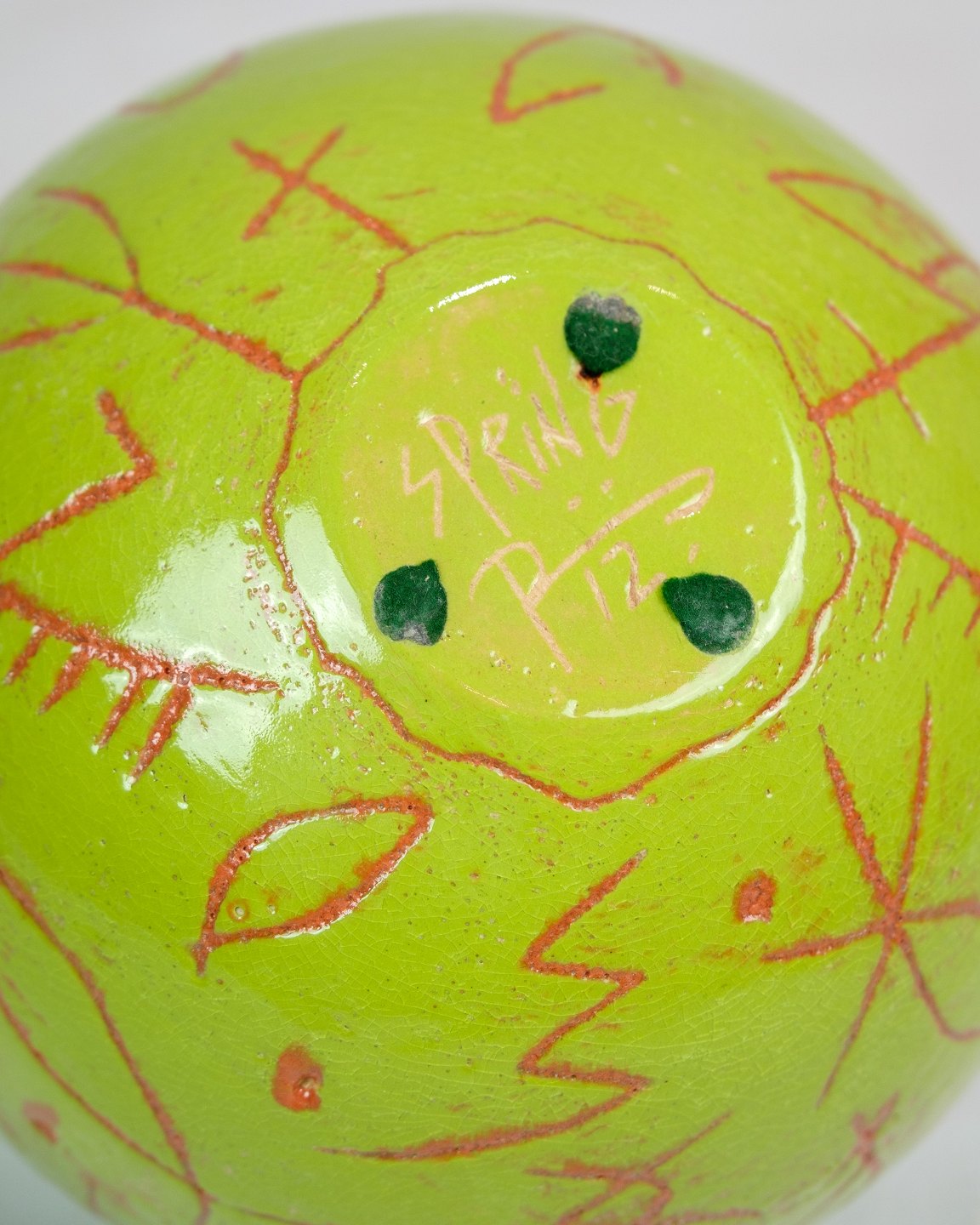 Lene Regius' runde vase med sort top, grøn glasur og orange mønstrede indgraveringer fra omkring 1980'erne repræsenterer en unik periode inden for keramisk design. Vasen kombinerer forskellige farver og mønstre for at skabe et karakteristisk udtryk, typisk for den tid og kunstnerens stil.