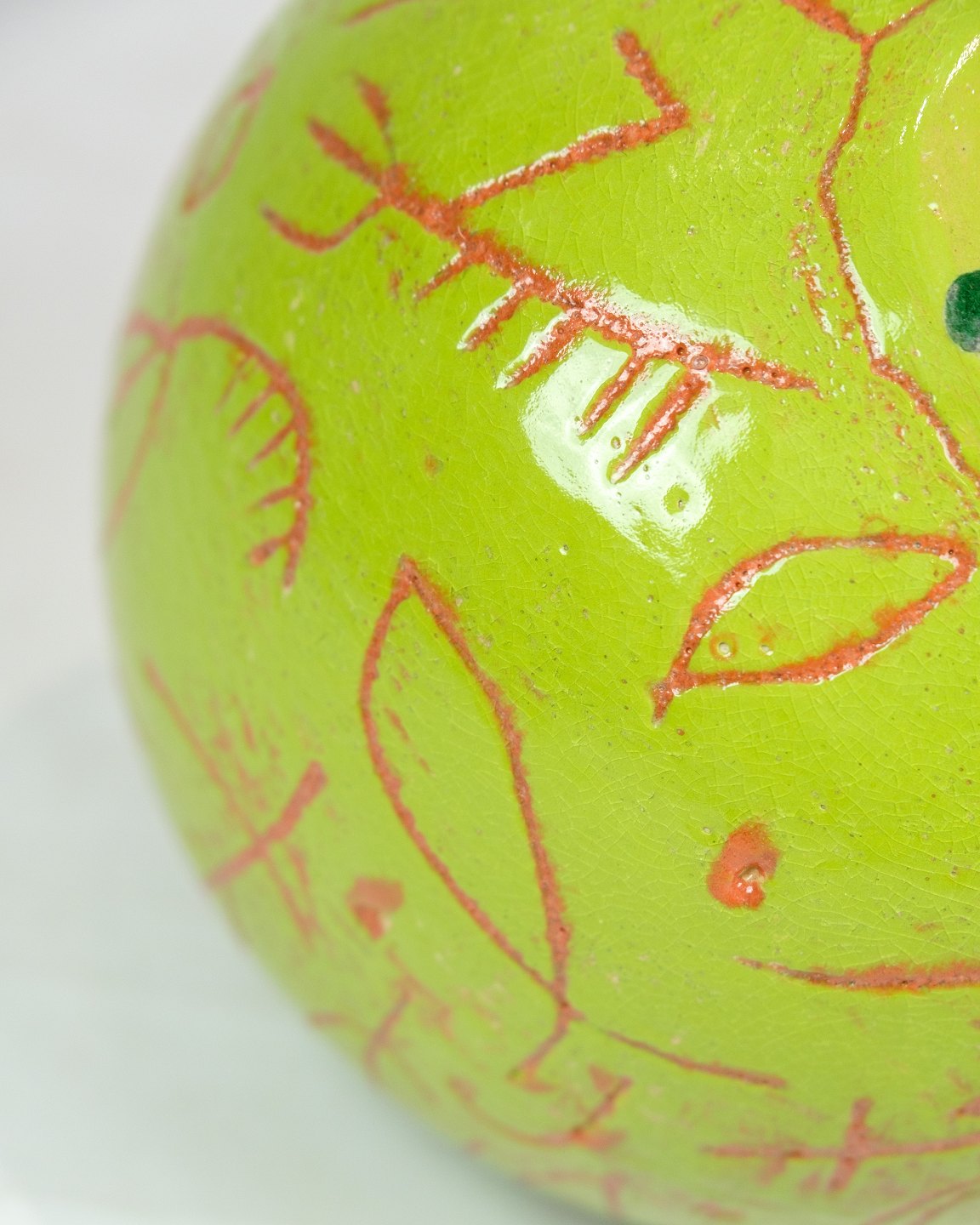 Det sorte øverste lag kontrasterer smukt med den grønne glasur og skaber en visuel dybde i vasen. De orange mønstrede indgraveringer tilføjer et element af detaljer og kompleksitet, hvilket gør vasen til et kunstnerisk og iøjnefaldende stykke.