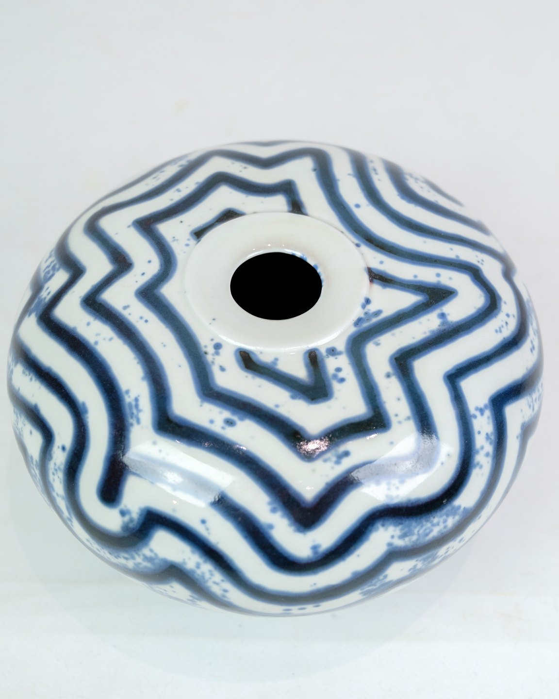 Kontakt os vedrørende prisKeramikvase af Per Weiss (1953-2023) mønstret med blå og hvide farver fra omkring 1990'erne. Per Weiss var en anerkendt dansk keramiker kendt for sit talent og hans bidrag til kunsthåndværkets verden. Han var bosat i Gammel Lejre, hvor han udførte sit håndværk og havde sin butik.