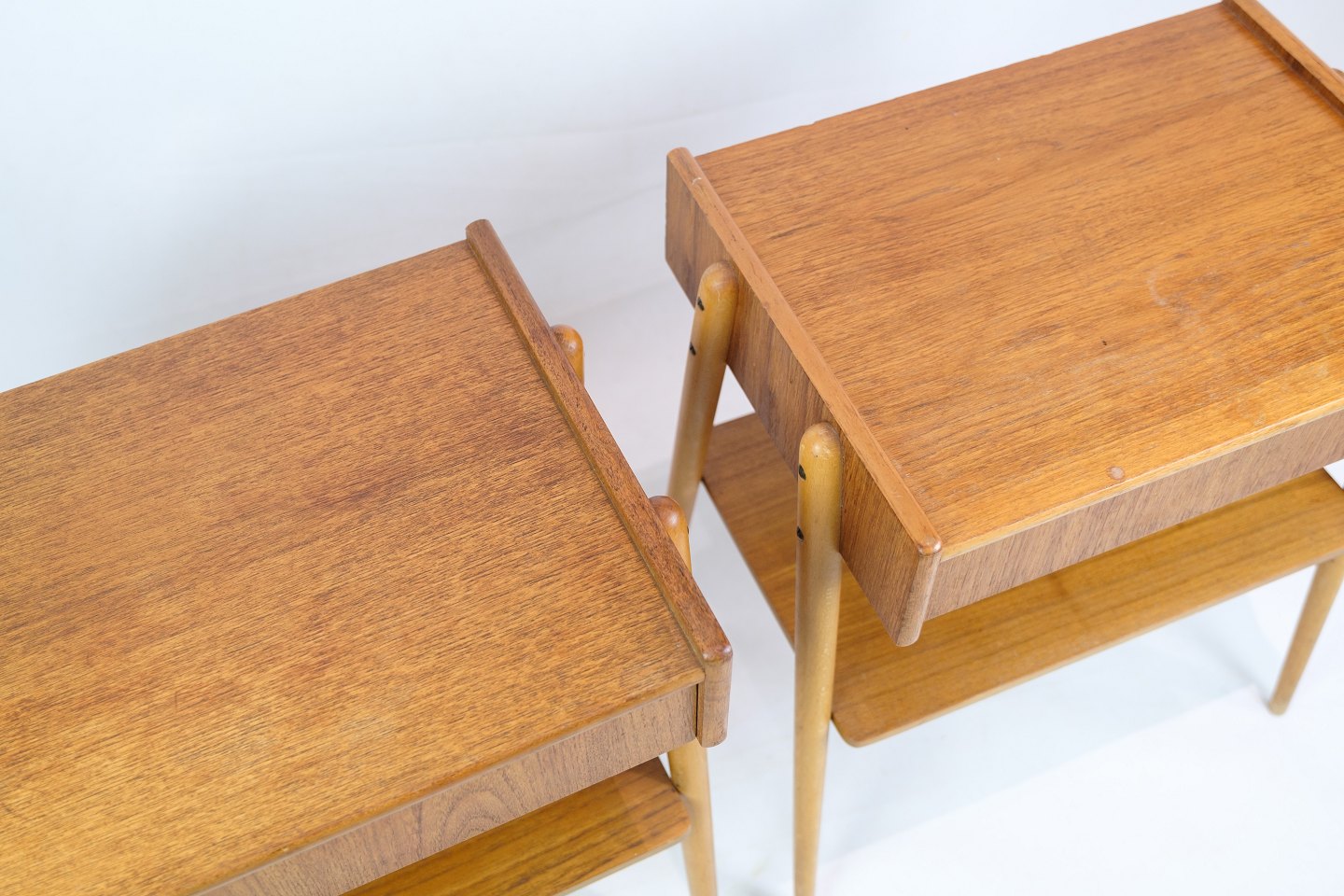SoldSet of bedside tables on legs with drawer and shelf, manufactured by AB Carlström & Co møbelfabrik in Sweden from the 1950s. These bedside tables represent the timeless and functional design that characterizes Scandinavian furniture art from the period. The leg structure gives a light and airy appearance, while the drawer and shelf offer practical storage space. The manufacturer, AB Carlström & Co, was known for creating quality furniture.