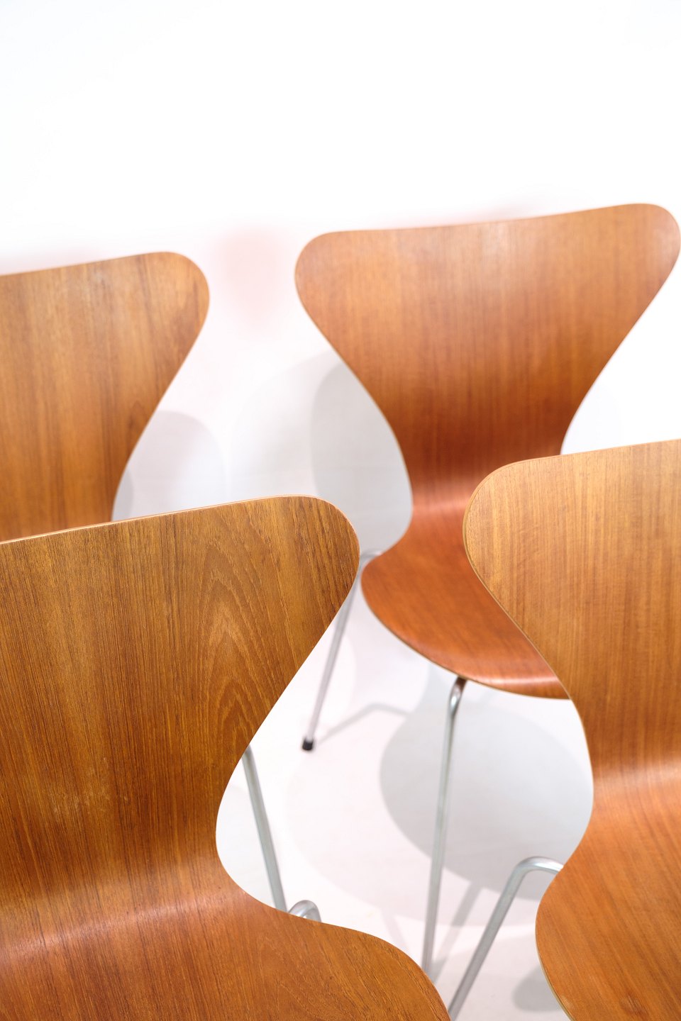 Dette sæt består af fire ikoniske "Syver" stole designet af Arne Jacobsen og produceret af Fritz Hansen i 1960'erne. Stolene er konstrueret af teaktræ og er et fremragende eksempel på dansk møbeldesign fra denne æra.