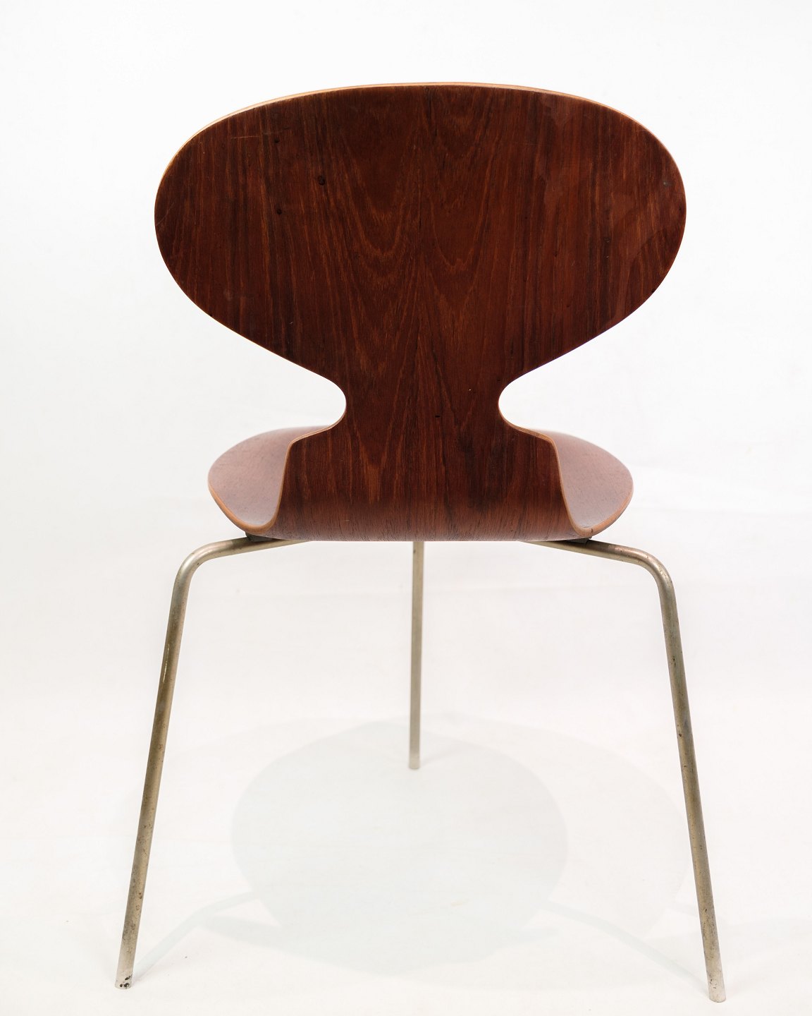 Denne stol er kendt som Model 3100 Myren, designet af den ikoniske danske arkitekt og designer Arne Jacobsen for Fritz Hansen i 1950. Stolen er berømt for sit karakteristiske, organisk formede sæde, der minder om en myres silhuet, hvilket har givet den sit populære kælenavn "Myren". Den er lavet af teaktræ og repræsenterer et tidløst eksempel på dansk modernistisk design, der stadig værdsættes af designentusiaster og samlere over hele verden.